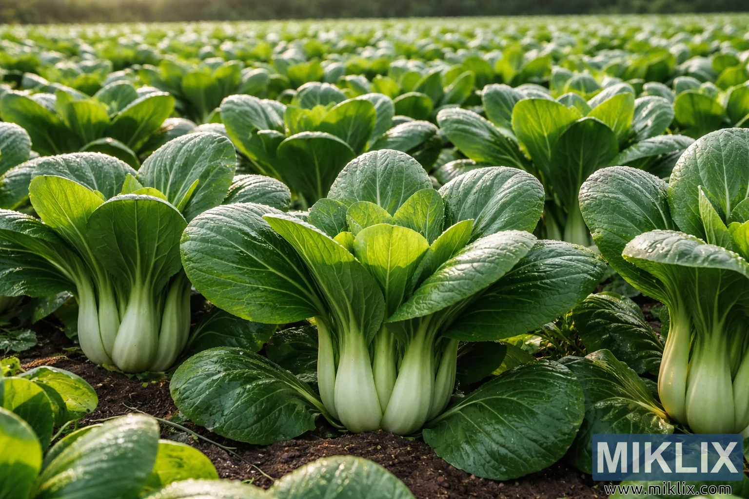 ਇਹ ਤਸਵੀਰ ਸਿਖਰ 'ਤੇ ਪੱਕਣ 'ਤੇ ਇੱਕ ਵਧਦੇ-ਫੁੱਲਦੇ ਬੋਕ ਚੋਏ ਖੇਤ ਦੇ ਇੱਕ ਵਿਸ਼ਾਲ, ਲੈਂਡਸਕੇਪ-ਮੁਖੀ ਦ੍ਰਿਸ਼ ਨੂੰ ਦਰਸਾਉਂਦੀ ਹੈ, ਜੋ ਕਿ ਨਰਮ ਕੁਦਰਤੀ ਰੌਸ਼ਨੀ ਵਿੱਚ ਕੈਦ ਕੀਤੀ ਗਈ ਹੈ ਜੋ ਸਵੇਰੇ ਜਾਂ ਦੇਰ ਦੁਪਹਿਰ ਨੂੰ ਦਰਸਾਉਂਦੀ ਹੈ। ਫੋਰਗਰਾਉਂਡ ਵਿੱਚ, ਕਈ ਪੂਰੀ ਤਰ੍ਹਾਂ ਵਧੇ ਹੋਏ ਬੋਕ ਚੋਏ ਪੌਦੇ ਦ੍ਰਿਸ਼ 'ਤੇ ਹਾਵੀ ਹੁੰਦੇ ਹਨ, ਹਰ ਇੱਕ ਚੌੜੇ, ਚਮਚੇ ਦੇ ਆਕਾਰ ਦੇ ਪੱਤੇ ਪ੍ਰਦਰਸ਼ਿਤ ਕਰਦੇ ਹਨ ਜੋ ਪਰਤਦਾਰ ਗੁਲਾਬਾਂ ਵਿੱਚ ਬਾਹਰ ਵੱਲ ਫੈਲਦੇ ਹਨ। ਪੱਤੇ ਇੱਕ ਅਮੀਰ, ਸੰਤ੍ਰਿਪਤ ਹਰੇ ਰੰਗ ਦੇ ਹੁੰਦੇ ਹਨ ਜਿਸ ਵਿੱਚ ਦਿਖਾਈ ਦੇਣ ਵਾਲੀਆਂ ਨਾੜੀਆਂ ਅਤੇ ਥੋੜ੍ਹੀ ਜਿਹੀ ਲਹਿਰਾਂ ਵਾਲੇ ਕਿਨਾਰੇ ਹੁੰਦੇ ਹਨ, ਜੋ ਸਿਹਤਮੰਦ ਵਿਕਾਸ ਅਤੇ ਲੋੜੀਂਦੀ ਹਾਈਡਰੇਸ਼ਨ ਨੂੰ ਦਰਸਾਉਂਦੇ ਹਨ। ਨਮੀ ਦੀਆਂ ਛੋਟੀਆਂ ਬੂੰਦਾਂ ਪੱਤਿਆਂ ਦੀਆਂ ਸਤਹਾਂ ਨਾਲ ਚਿਪਕ ਜਾਂਦੀਆਂ ਹਨ, ਰੌਸ਼ਨੀ ਨੂੰ ਫੜਦੀਆਂ ਹਨ ਅਤੇ ਇੱਕ ਸੂਖਮ ਚਮਕ ਜੋੜਦੀਆਂ ਹਨ ਜੋ ਤਾਜ਼ਗੀ ਦੀ ਭਾਵਨਾ ਨੂੰ ਵਧਾਉਂਦੀਆਂ ਹਨ। ਹਰੇਕ ਪੌਦੇ ਦੇ ਅਧਾਰ 'ਤੇ ਸੰਘਣੇ, ਫਿੱਕੇ ਹਰੇ ਤੋਂ ਚਿੱਟੇ ਡੰਡੇ ਕੱਸ ਕੇ ਇਕੱਠੇ ਹੋਏ ਅਤੇ ਮਜ਼ਬੂਤ ਹੁੰਦੇ ਹਨ, ਹਨੇਰੇ, ਚੰਗੀ ਤਰ੍ਹਾਂ ਟਿੱਲ ਕੀਤੀ ਮਿੱਟੀ ਤੋਂ ਸਾਫ਼-ਸਾਫ਼ ਉੱਭਰਦੇ ਹਨ।