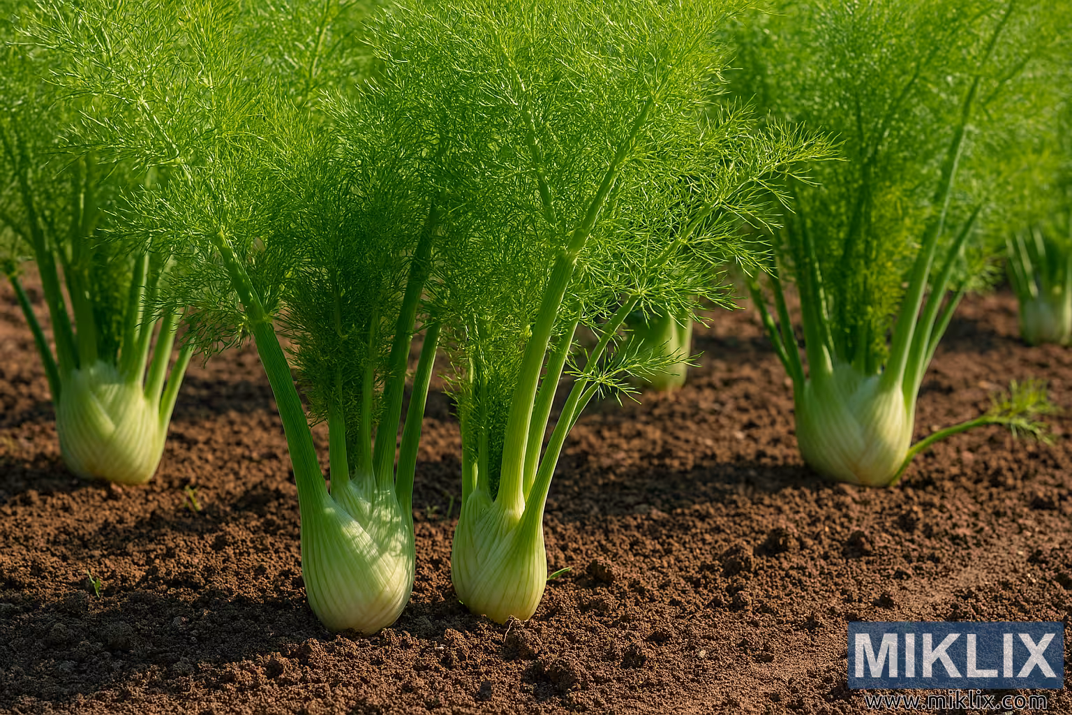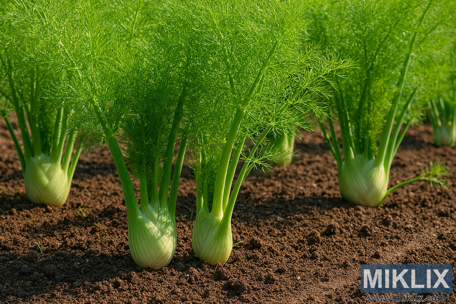 ਇਹ ਉੱਚ-ਰੈਜ਼ੋਲਿਊਸ਼ਨ ਵਾਲੀ ਲੈਂਡਸਕੇਪ ਫੋਟੋ ਪੂਰੀ ਧੁੱਪ ਹੇਠ ਇੱਕ ਚੰਗੀ ਤਰ੍ਹਾਂ ਨਿਕਾਸ ਵਾਲੇ ਬਾਗ਼ ਦੇ ਬਿਸਤਰੇ ਵਿੱਚ ਉੱਗ ਰਹੀ ਸੌਂਫ (ਫੋਨੀਕੁਲਮ ਵਲਗੇਰ) ਦੇ ਇੱਕ ਵਧਦੇ-ਫੁੱਲਦੇ ਟੁਕੜੇ ਨੂੰ ਦਰਸਾਉਂਦੀ ਹੈ। ਇਹ ਰਚਨਾ ਅਗਲੇ ਹਿੱਸੇ ਵਿੱਚ ਚਾਰ ਪ੍ਰਮੁੱਖ ਸੌਂਫ ਦੇ ਪੌਦਿਆਂ 'ਤੇ ਕੇਂਦ੍ਰਿਤ ਹੈ, ਹਰੇਕ ਦਾ ਇੱਕ ਫਿੱਕਾ ਹਰਾ-ਚਿੱਟਾ ਬਲਬਸ ਅਧਾਰ ਮਿੱਟੀ ਦੇ ਉੱਪਰ ਅੰਸ਼ਕ ਤੌਰ 'ਤੇ ਖੁੱਲ੍ਹਾ ਹੈ। ਇਹ ਅਧਾਰ ਮਜ਼ਬੂਤ, ਥੋੜ੍ਹਾ ਜਿਹਾ ਚਪਟਾ, ਅਤੇ ਉੱਪਰ ਵੱਲ ਸੰਘਣੇ, ਨਿਰਵਿਘਨ ਡੰਡਿਆਂ ਵਿੱਚ ਬਦਲਦੇ ਹਨ ਜੋ ਉੱਪਰ ਉੱਠਦੇ ਹੀ ਅਧਾਰ 'ਤੇ ਹਲਕੇ ਹਰੇ ਤੋਂ ਡੂੰਘੇ ਹਰੇ ਵਿੱਚ ਬਦਲ ਜਾਂਦੇ ਹਨ।