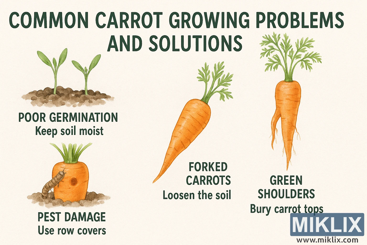 ਇੱਕ ਵਿਸਤ੍ਰਿਤ ਇਨਫੋਗ੍ਰਾਫਿਕ ਜੋ ਗਾਜਰ ਉਗਾਉਣ ਦੀਆਂ ਆਮ ਸਮੱਸਿਆਵਾਂ ਬਾਰੇ ਦੱਸਦਾ ਹੈ - ਜਿਸ ਵਿੱਚ ਮਾੜਾ ਉਗਣਾ, ਕਾਂਟੇਦਾਰ ਗਾਜਰ, ਕੀੜਿਆਂ ਦਾ ਨੁਕਸਾਨ, ਅਤੇ ਹਰੇ ਮੋਢੇ ਸ਼ਾਮਲ ਹਨ - ਸਰਲ, ਵਿਹਾਰਕ ਹੱਲਾਂ ਦੇ ਨਾਲ।