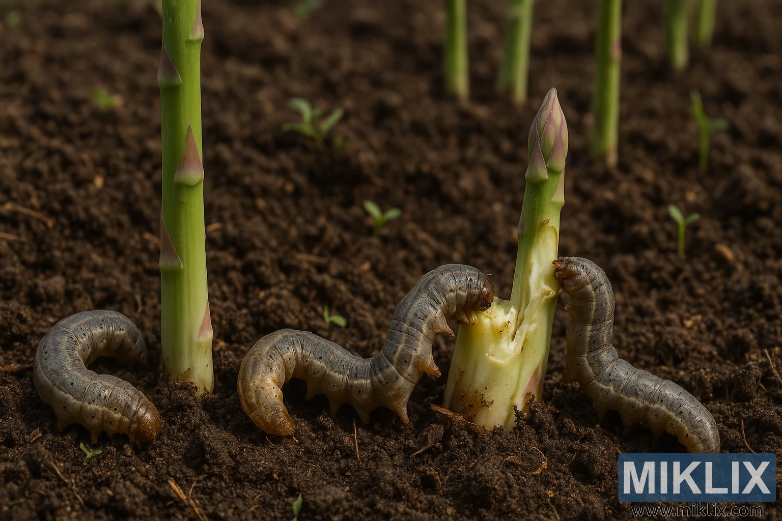 ਬਾਗ ਦੇ ਬਿਸਤਰੇ ਵਿੱਚ ਨੌਜਵਾਨ ਐਸਪੈਰਗਸ ਸਪੀਅਰਸ ਨੂੰ ਨੁਕਸਾਨ ਪਹੁੰਚਾਉਣ ਵਾਲੇ ਕੱਟਵਰਮਾਂ ਦਾ ਇੱਕ ਨਜ਼ਦੀਕੀ ਦ੍ਰਿਸ਼, ਮਿੱਟੀ, ਸਪਾਉਟ ਅਤੇ ਸੁੰਡੀਆਂ ਦੀ ਗਤੀਵਿਧੀ ਨੂੰ ਦਰਸਾਉਂਦਾ ਹੈ।