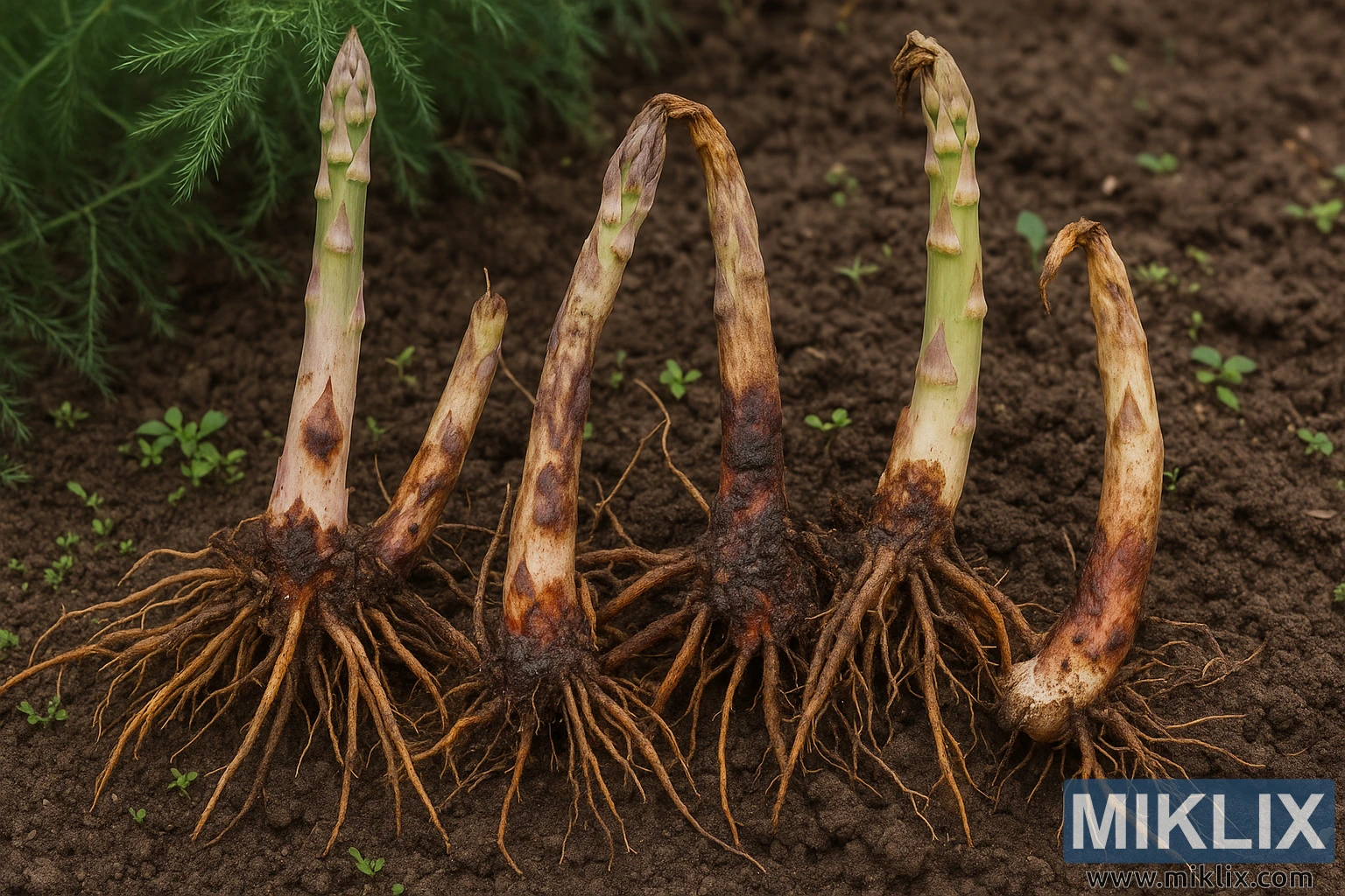 ਚਿੱਤਰ: ਬਾਗ ਦੀ ਮਿੱਟੀ ਵਿੱਚ ਫੁਸਾਰਿਅਮ ਕਰਾਊਨ ਅਤੇ ਜੜ੍ਹ ਸੜਨ ਵਾਲਾ ਐਸਪੈਰਾਗਸ