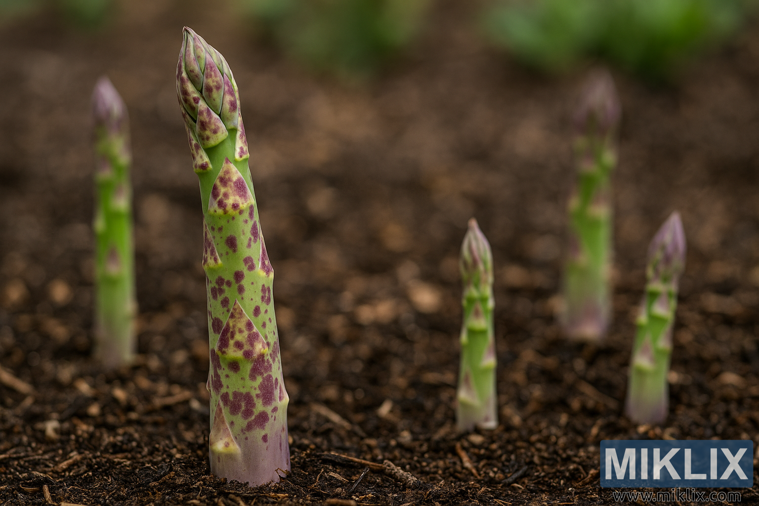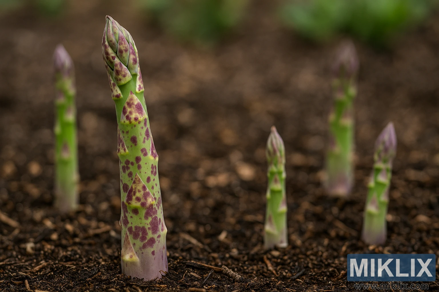 ਬਾਗ਼ ਦੇ ਬਿਸਤਰੇ ਤੋਂ ਨਿਕਲ ਰਹੇ ਐਸਪੈਰਾਗਸ ਸਪੀਅਰਸ ਦੀ ਇੱਕ ਵਿਸਤ੍ਰਿਤ ਨਜ਼ਦੀਕੀ ਤਸਵੀਰ, ਜੋ ਤਣਿਆਂ 'ਤੇ ਵਿਸ਼ੇਸ਼ ਜਾਮਨੀ ਧੱਬਿਆਂ ਦੇ ਜ਼ਖ਼ਮ ਦਿਖਾਉਂਦੀ ਹੈ।