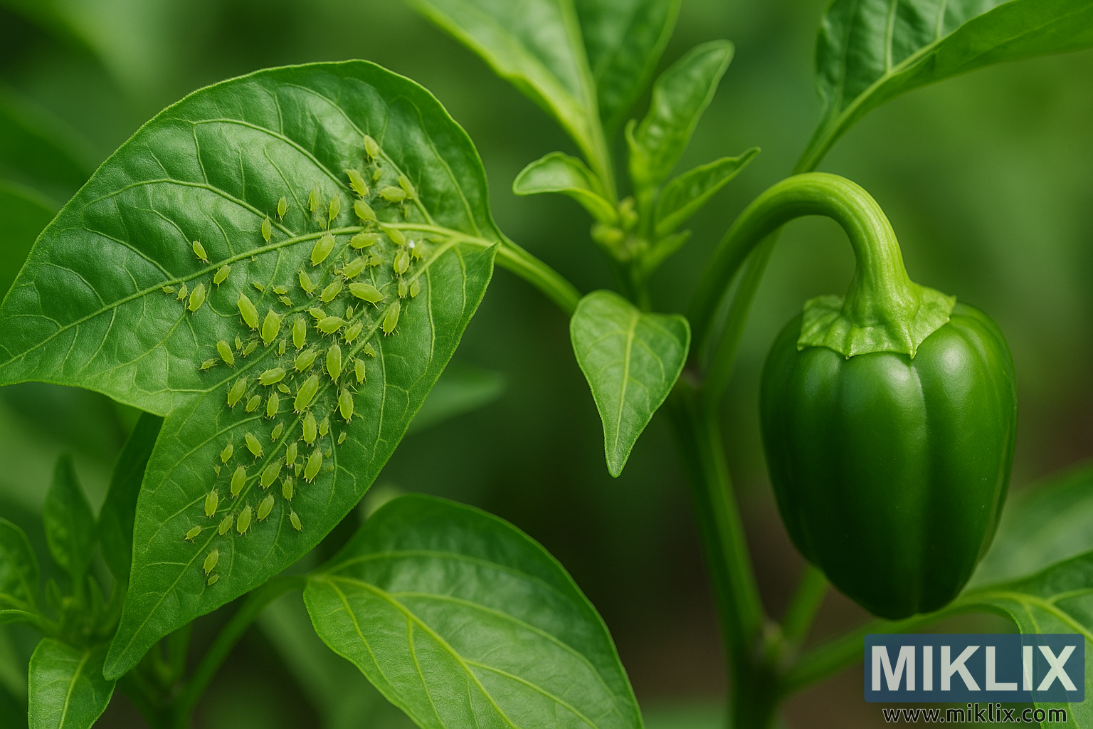 ਐਫੀਡ ਨਾਲ ਢੱਕੇ ਪੱਤੇ ਦੇ ਸੱਜੇ ਪਾਸੇ, ਇੱਕ ਛੋਟੀ ਹਰੀ ਸ਼ਿਮਲਾ ਮਿਰਚ ਪੌਦੇ ਤੋਂ ਲਟਕਦੀ ਹੈ, ਇਸਦੀ ਨਿਰਵਿਘਨ, ਚਮਕਦਾਰ ਸਤਹ ਨੇੜਲੇ ਪੱਤਿਆਂ ਦੀ ਬਣਤਰ ਵਾਲੀ ਦਿੱਖ ਦੇ ਉਲਟ ਹੈ। ਮਿਰਚ ਦਾ ਵਕਰ ਵਾਲਾ ਤਣਾ ਇਸਨੂੰ ਪੌਦੇ ਨਾਲ ਸ਼ਾਨਦਾਰ ਢੰਗ ਨਾਲ ਜੋੜਦਾ ਹੈ, ਅਤੇ ਐਫੀਡ ਕਲੋਨੀ ਦੀ ਮੌਜੂਦਗੀ ਦੇ ਬਾਵਜੂਦ ਆਲੇ ਦੁਆਲੇ ਦੇ ਪੱਤੇ ਜੀਵੰਤ ਅਤੇ ਸਿਹਤਮੰਦ ਦਿਖਾਈ ਦਿੰਦੇ ਹਨ। ਪਿਛੋਕੜ ਵਿੱਚ ਹੌਲੀ-ਹੌਲੀ ਧੁੰਦਲੀ ਹਰਿਆਲੀ ਹੁੰਦੀ ਹੈ, ਜੋ ਖੇਤ ਦੀ ਇੱਕ ਖੋਖਲੀ ਡੂੰਘਾਈ ਦੁਆਰਾ ਪੈਦਾ ਹੁੰਦੀ ਹੈ ਜੋ ਇੱਕ ਕੁਦਰਤੀ, ਡੁੱਬਣ ਵਾਲੀ ਸੈਟਿੰਗ ਨੂੰ ਬਣਾਈ ਰੱਖਦੇ ਹੋਏ ਐਫੀਡ ਅਤੇ ਮਿਰਚ 'ਤੇ ਤੇਜ਼ੀ ਨਾਲ ਧਿਆਨ ਕੇਂਦਰਿਤ ਕਰਦੀ ਹੈ।