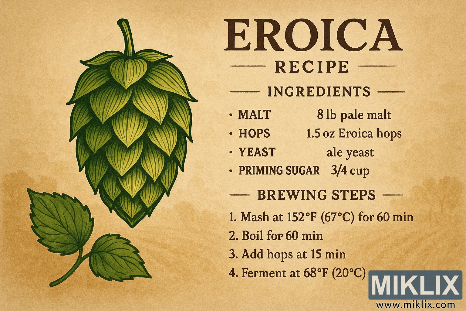 ਇਹ ਖੂਬਸੂਰਤੀ ਨਾਲ ਡਿਜ਼ਾਈਨ ਕੀਤਾ ਗਿਆ ਚਿੱਤਰ ਇਰੋਈਕਾ ਹੌਪਸ ਨਾਲ ਬਣਾਉਣ ਲਈ ਇੱਕ ਵਿਅੰਜਨ ਕਾਰਡ ਪੇਸ਼ ਕਰਦਾ ਹੈ, ਜੋ ਰਵਾਇਤੀ ਕਾਰੀਗਰੀ ਦੀ ਸ਼ਾਨ ਨੂੰ ਆਧੁਨਿਕ ਵਿਅੰਜਨ ਲੇਆਉਟ ਦੀ ਸਪਸ਼ਟਤਾ ਨਾਲ ਮਿਲਾਉਂਦਾ ਹੈ। ਇਹ ਡਿਜ਼ਾਈਨ ਇੱਕ ਨਿੱਘੇ, ਮਿੱਟੀ ਦੇ ਰੰਗ ਪੈਲੇਟ ਵਿੱਚ ਬਣਿਆ ਹੈ ਜਿਸ ਵਿੱਚ ਚਰਮ-ਵਰਗੇ ਬੇਜ ਅਤੇ ਓਚਰ ਦੇ ਟੋਨ ਹਨ, ਜੋ ਪੇਂਡੂ ਸੁਹਜ ਅਤੇ ਕਾਰੀਗਰੀ ਪ੍ਰਮਾਣਿਕਤਾ ਦਾ ਮਾਹੌਲ ਪੈਦਾ ਕਰਦੇ ਹਨ। ਵਿਜ਼ੂਅਲ ਸੁਹਜ ਕੁਝ ਹੱਥ ਨਾਲ ਬਣਾਇਆ ਗਿਆ ਸੁਝਾਅ ਦਿੰਦਾ ਹੈ, ਪਰ ਸਟੀਕ - ਵਿਰਾਸਤ ਅਤੇ ਦੇਖਭਾਲ ਨਾਲ ਪੂਰੀ ਤਰ੍ਹਾਂ ਮੇਲ ਖਾਂਦਾ ਹੈ ਜੋ ਅਕਸਰ ਵਿਸ਼ੇਸ਼ ਹੌਪ ਕਿਸਮਾਂ ਨਾਲ ਜੁੜਿਆ ਹੁੰਦਾ ਹੈ।