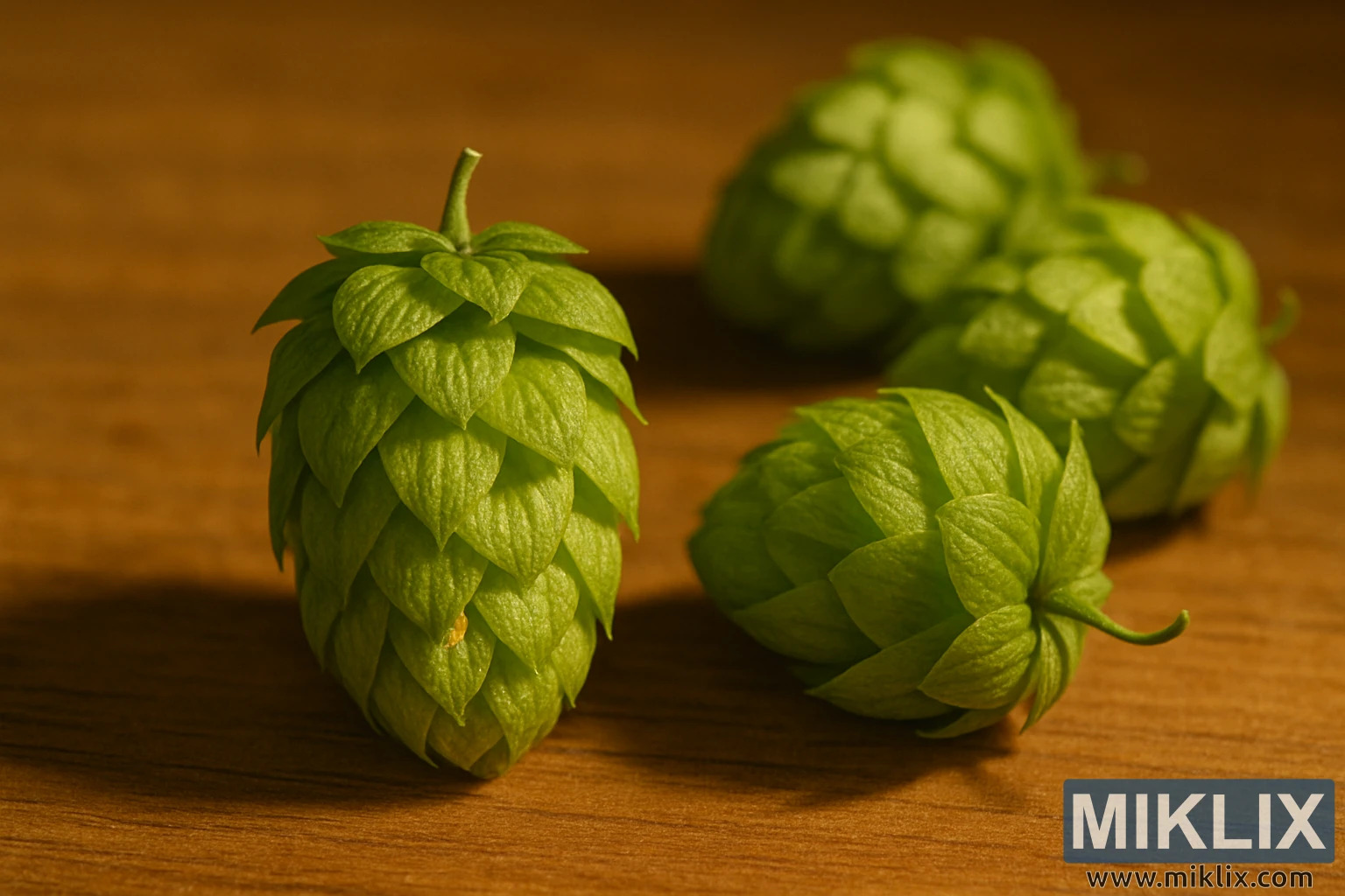 ਪਾਸੇ ਵੱਲ ਅਤੇ ਫੀਲਡ ਦੀ ਘੱਟ ਡੂੰਘਾਈ ਨਾਲ ਥੋੜ੍ਹਾ ਧੁੰਦਲਾ, ਲੱਕੜ ਦੀ ਸਤ੍ਹਾ 'ਤੇ ਤਿੰਨ ਹੋਰ ਹੌਪ ਕੋਨ ਪਏ ਹਨ। ਉਨ੍ਹਾਂ ਦੇ ਨਰਮ ਕਿਨਾਰੇ ਅਤੇ ਵਧੇਰੇ ਫੈਲੀ ਹੋਈ ਰੋਸ਼ਨੀ ਡੂੰਘਾਈ ਦੀ ਭਾਵਨਾ ਪੈਦਾ ਕਰਦੀ ਹੈ, ਅੱਖ ਨੂੰ ਫੋਰਗਰਾਉਂਡ ਵਿੱਚ ਤਿੱਖੀ ਪਰਿਭਾਸ਼ਿਤ ਵਿਸ਼ੇ ਵੱਲ ਵਾਪਸ ਲੈ ਜਾਂਦੀ ਹੈ। ਕੋਮਲ ਧੁੰਦਲੇਪਣ ਦੇ ਵਿਰੁੱਧ ਤਿੱਖੀ ਫੋਕਸ ਦੀ ਖੇਡ ਵੇਰਵੇ ਅਤੇ ਵਾਤਾਵਰਣ ਦੇ ਸੰਤੁਲਨ ਨੂੰ ਦਰਸਾਉਂਦੀ ਹੈ, ਇਹ ਯਕੀਨੀ ਬਣਾਉਂਦੀ ਹੈ ਕਿ ਦਰਸ਼ਕ ਦਾ ਧਿਆਨ ਪ੍ਰਾਇਮਰੀ ਕੋਨ ਦੀ ਬਣਤਰ ਅਤੇ ਪੇਚੀਦਗੀਆਂ 'ਤੇ ਸਥਿਰ ਰਹਿੰਦਾ ਹੈ ਜਦੋਂ ਕਿ ਅਜੇ ਵੀ ਵਿਸ਼ਾਲ ਪ੍ਰਬੰਧ ਦੀ ਕਦਰ ਕਰਦੇ ਹਨ। ਕੋਨ ਦੇ ਦਿਸ਼ਾ-ਨਿਰਦੇਸ਼ ਥੋੜੇ ਵੱਖਰੇ ਹੁੰਦੇ ਹਨ - ਕੁਝ ਆਪਣੇ ਪਾਸੇ ਪਏ ਹੁੰਦੇ ਹਨ, ਕੁਝ ਇੱਕ ਕੋਣ 'ਤੇ - ਰਚਨਾ ਵਿੱਚ ਇੱਕ ਕੁਦਰਤੀ ਤਾਲ ਜੋੜਦੇ ਹਨ ਅਤੇ ਕਠੋਰਤਾ ਤੋਂ ਬਚਦੇ ਹਨ। ਇਹ ਸੂਖਮ ਭਿੰਨਤਾ ਇਸ ਭਾਵਨਾ ਨੂੰ ਵਧਾਉਂਦੀ ਹੈ ਕਿ ਹੌਪਸ ਹੁਣੇ ਹੀ ਤਾਜ਼ੇ ਕੱਟੇ ਗਏ ਹਨ ਅਤੇ ਆਸਾਨੀ ਨਾਲ ਸੈੱਟ ਕੀਤੇ ਗਏ ਹਨ।