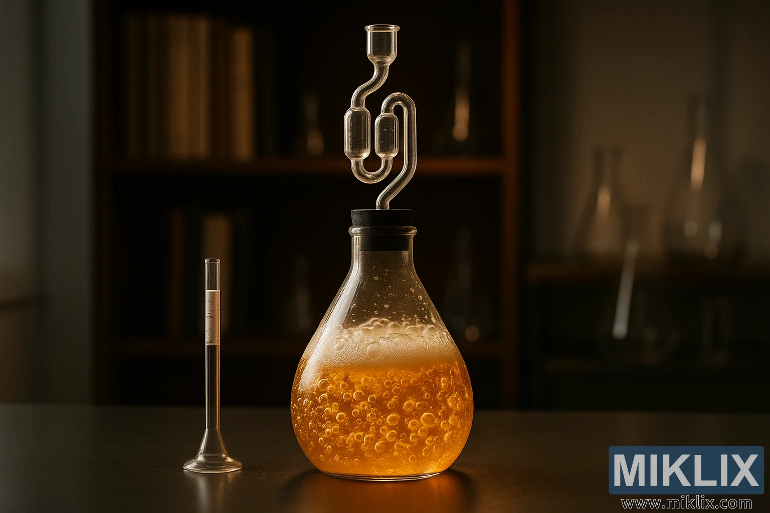 ਅੰਤ ਵਿੱਚ, ਇਹ ਚਿੱਤਰ ਜੀਵ ਵਿਗਿਆਨ ਅਤੇ ਕਾਰੀਗਰੀ ਦੇ ਵਿਚਕਾਰ ਲਾਂਘੇ ਦਾ ਜਸ਼ਨ ਹੈ। ਇਹ ਖਮੀਰ ਦੀ ਅਦਿੱਖ ਮਿਹਨਤ, ਵਿਗਿਆਨਕ ਸੰਦਾਂ ਦੀ ਸ਼ੁੱਧਤਾ, ਅਤੇ ਮਨੁੱਖੀ ਉਤਸੁਕਤਾ ਦਾ ਸਨਮਾਨ ਕਰਦਾ ਹੈ ਜੋ ਪ੍ਰਯੋਗ ਨੂੰ ਚਲਾਉਂਦਾ ਹੈ। ਆਪਣੀ ਰੋਸ਼ਨੀ, ਰਚਨਾ ਅਤੇ ਵੇਰਵੇ ਦੁਆਰਾ, ਇਹ ਚਿੱਤਰ ਪਰਿਵਰਤਨ ਦੀ ਕਹਾਣੀ ਦੱਸਦਾ ਹੈ—ਖੰਡ ਦੇ ਸ਼ਰਾਬ ਬਣਨ, ਤਰਲ ਦੇ ਬੀਅਰ ਬਣਨ, ਅਤੇ ਗਿਆਨ ਦੇ ਸੁਆਦ ਬਣਨ। ਇਹ ਦਰਸ਼ਕ ਨੂੰ ਫਰਮੈਂਟੇਸ਼ਨ ਨੂੰ ਸਿਰਫ਼ ਇੱਕ ਪ੍ਰਕਿਰਿਆ ਵਜੋਂ ਹੀ ਨਹੀਂ, ਸਗੋਂ ਕੁਦਰਤ ਅਤੇ ਇਰਾਦੇ ਵਿਚਕਾਰ ਇੱਕ ਜੀਵਤ, ਸਾਹ ਲੈਣ ਵਾਲੇ ਸਹਿਯੋਗ ਵਜੋਂ ਪ੍ਰਸ਼ੰਸਾ ਕਰਨ ਲਈ ਸੱਦਾ ਦਿੰਦਾ ਹੈ।