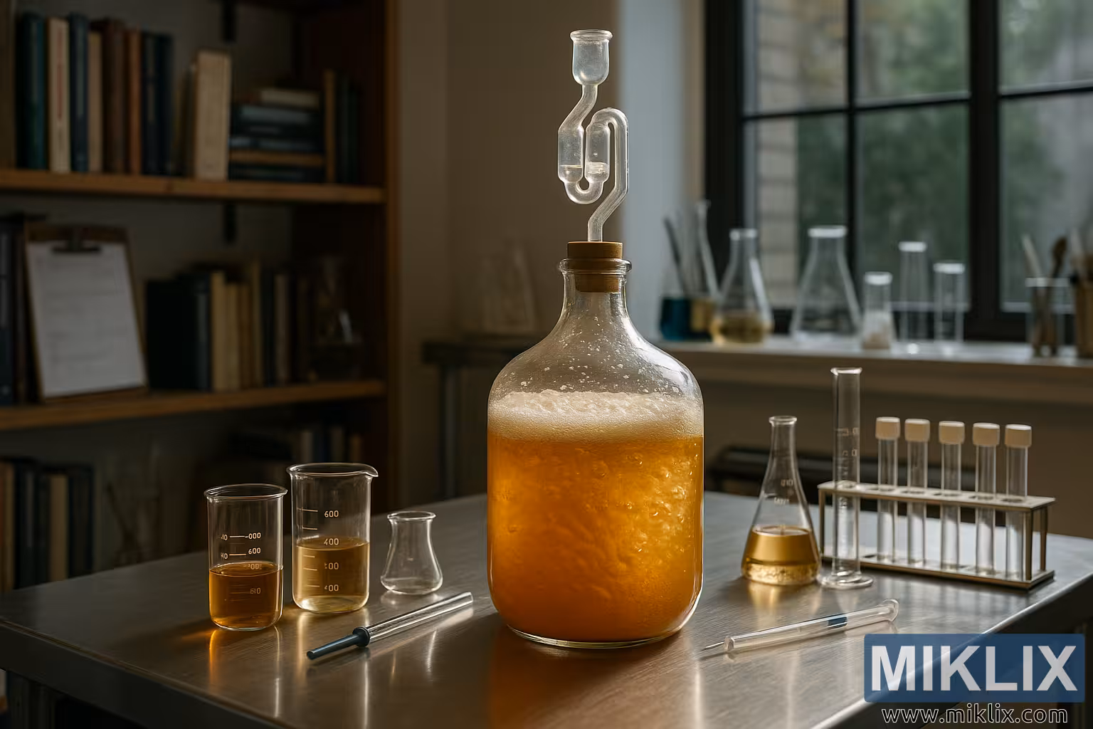 ਇੱਕ ਚੰਗੀ ਤਰ੍ਹਾਂ ਪ੍ਰਕਾਸ਼ਮਾਨ ਮਾਈਕ੍ਰੋਬਰੂਅਰੀ ਲੈਬ ਜਿਸ ਵਿੱਚ ਘੁੰਮਦੇ ਸੁਨਹਿਰੀ ਖਮੀਰ ਦਾ ਇੱਕ ਕਾਰਬੋਆ ਹੈ, ਜੋ ਕਿ ਸਟੀਕ ਵਿਗਿਆਨਕ ਯੰਤਰਾਂ ਅਤੇ ਬਰੂਇੰਗ ਲੌਗਾਂ ਨਾਲ ਘਿਰਿਆ ਹੋਇਆ ਹੈ।