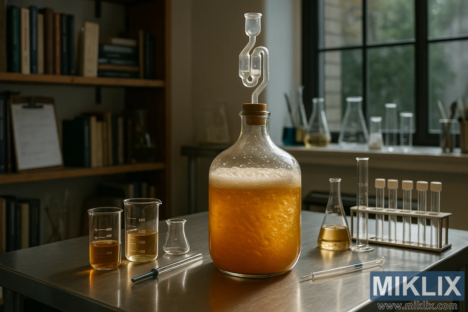ਕਾਰਬੌਏ ਦੇ ਆਲੇ-ਦੁਆਲੇ ਵਿਗਿਆਨਕ ਯੰਤਰਾਂ ਦੀ ਇੱਕ ਬਹੁਤ ਹੀ ਸਾਵਧਾਨੀ ਨਾਲ ਵਿਵਸਥਿਤ ਲੜੀ ਹੈ। ਬੀਕਰ, ਪਾਈਪੇਟ, ਗ੍ਰੈਜੂਏਟਿਡ ਸਿਲੰਡਰ ਅਤੇ ਫਲਾਸਕ ਇੱਕ ਸਟੇਨਲੈਸ ਸਟੀਲ ਕਾਊਂਟਰ 'ਤੇ ਧਿਆਨ ਨਾਲ ਰੱਖੇ ਗਏ ਹਨ, ਉਨ੍ਹਾਂ ਦੀਆਂ ਸਾਫ਼ ਲਾਈਨਾਂ ਅਤੇ ਪਾਰਦਰਸ਼ੀ ਸਤਹਾਂ ਨੇੜੇ ਦੀਆਂ ਵੱਡੀਆਂ ਖਿੜਕੀਆਂ ਤੋਂ ਫਿਲਟਰ ਹੋਣ ਵਾਲੀ ਨਰਮ, ਕੁਦਰਤੀ ਰੌਸ਼ਨੀ ਨੂੰ ਦਰਸਾਉਂਦੀਆਂ ਹਨ। ਰੋਸ਼ਨੀ ਗਰਮ ਅਤੇ ਦਿਸ਼ਾ-ਨਿਰਦੇਸ਼ਿਤ ਹੈ, ਕੋਮਲ ਪਰਛਾਵੇਂ ਪਾਉਂਦੀ ਹੈ ਅਤੇ ਫਰਮੈਂਟਿੰਗ ਤਰਲ ਦੇ ਸੁਨਹਿਰੀ ਸੁਰਾਂ ਨੂੰ ਵਧਾਉਂਦੀ ਹੈ। ਇਹ ਸ਼ਾਂਤ ਇਕਾਗਰਤਾ ਦਾ ਮੂਡ ਪੈਦਾ ਕਰਦੀ ਹੈ, ਜਿਵੇਂ ਕਿ ਜਗ੍ਹਾ ਖੁਦ ਸੋਚ-ਸਮਝ ਕੇ ਪ੍ਰਯੋਗ ਅਤੇ ਸਟੀਕ ਨਿਰੀਖਣ ਨੂੰ ਉਤਸ਼ਾਹਿਤ ਕਰਨ ਲਈ ਤਿਆਰ ਕੀਤੀ ਗਈ ਹੈ। ਔਜ਼ਾਰ ਸਿਰਫ਼ ਸਜਾਵਟੀ ਨਹੀਂ ਹਨ - ਇਹ ਵਰਕਫਲੋ ਦਾ ਅਨਿੱਖੜਵਾਂ ਅੰਗ ਹਨ, ਜੋ ਕਿ ਸਹੀ ਵੇਰਵੇ ਦੇ ਨਾਲ ਫਰਮੈਂਟੇਸ਼ਨ ਦੀ ਪ੍ਰਗਤੀ ਦੇ ਨਮੂਨੇ ਲੈਣ, ਮਾਪਣ ਅਤੇ ਨਿਗਰਾਨੀ ਲਈ ਵਰਤੇ ਜਾਂਦੇ ਹਨ।