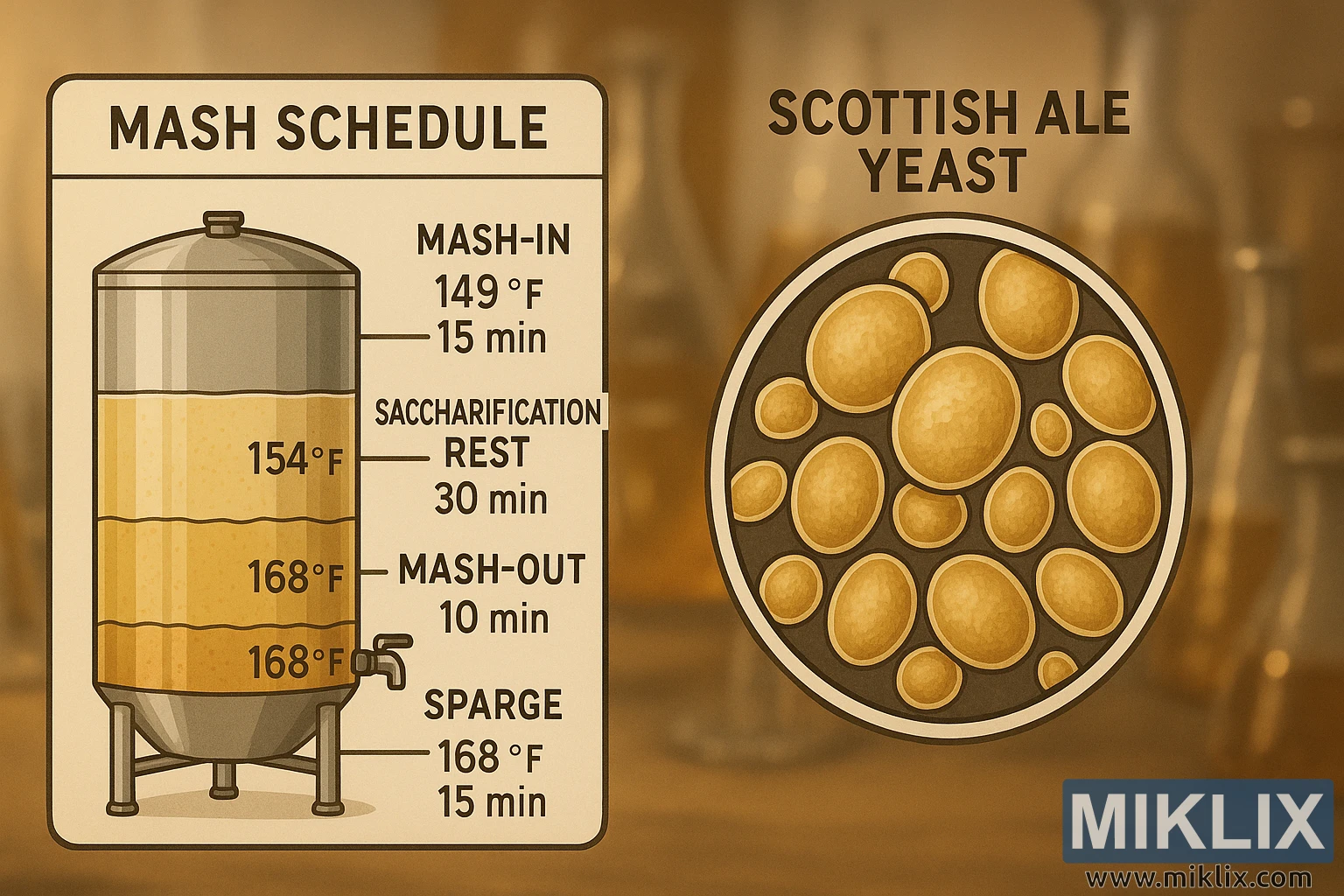 ਇੱਕ ਸਟੀਕ ਤਕਨੀਕੀ ਦ੍ਰਿਸ਼ਟਾਂਤ ਜਿਸ ਵਿੱਚ ਲੇਬਲ ਵਾਲਾ ਮੈਸ਼ ਸ਼ਡਿਊਲ ਹੈ ਜਿਸ ਵਿੱਚ ਸਕਾਟਿਸ਼ ਏਲ ਖਮੀਰ ਦੇ ਇੱਕ ਵਿਸਤ੍ਰਿਤ ਦ੍ਰਿਸ਼ ਦੇ ਨਾਲ ਜੋੜਿਆ ਗਿਆ ਹੈ, ਇੱਕ ਨਿੱਘੇ, ਵਿਗਿਆਨਕ ਬਰੂਇੰਗ ਪ੍ਰਯੋਗਸ਼ਾਲਾ ਦੇ ਪਿਛੋਕੜ ਦੇ ਵਿਰੁੱਧ ਸੈੱਟ ਕੀਤਾ ਗਿਆ ਹੈ।