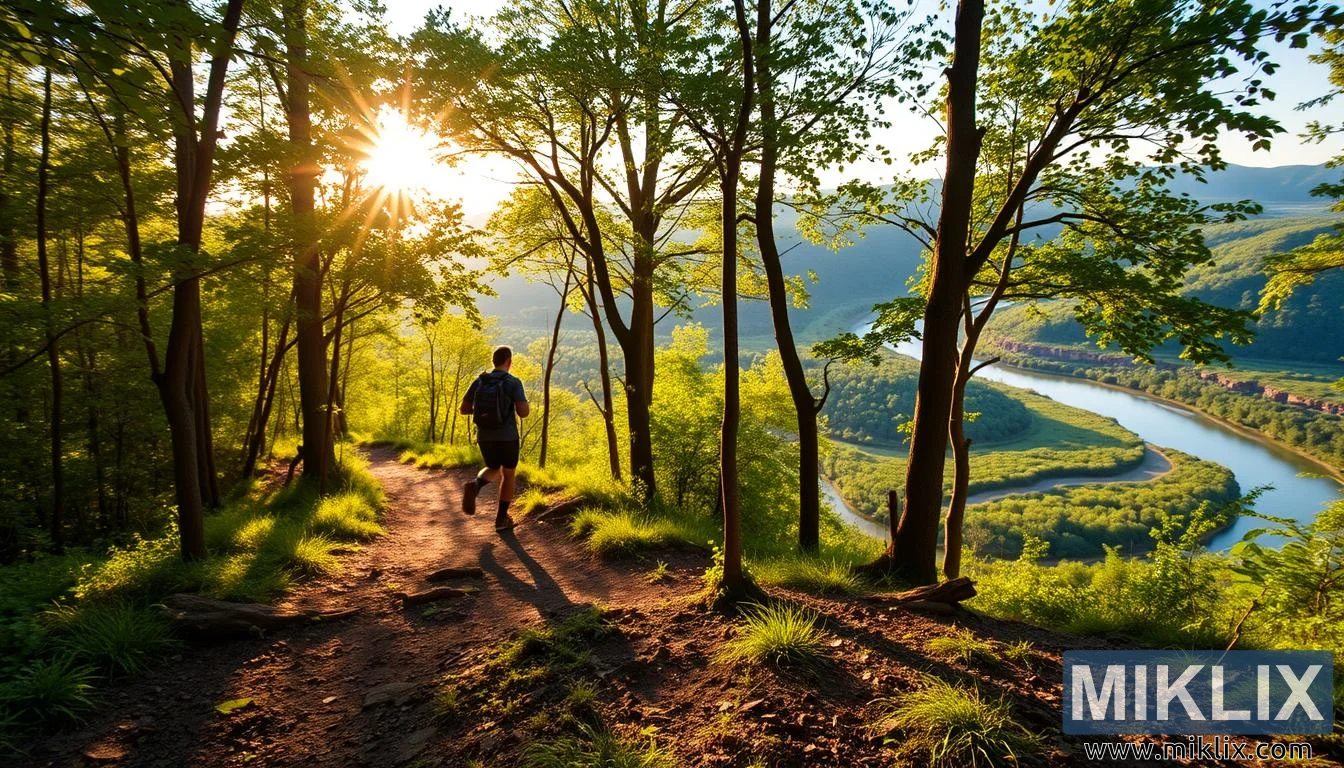 ਇੱਕ ਸ਼ਾਂਤ ਜੰਗਲੀ ਰਸਤਾ ਜਿਸ ਵਿੱਚ ਇੱਕ ਹਾਈਕਰ ਗਤੀਸ਼ੀਲ ਹੈ, ਰੁੱਖਾਂ ਵਿੱਚੋਂ ਲੰਘਦੀ ਸੂਰਜ ਦੀ ਰੌਸ਼ਨੀ, ਅਤੇ ਇੱਕ ਵਗਦੀ ਨਦੀ, ਜੋ ਜੀਵਨਸ਼ਕਤੀ, ਦਿਲ ਦੀ ਸਿਹਤ ਅਤੇ ਕੁਦਰਤ ਦੇ ਲਾਭਾਂ ਦਾ ਪ੍ਰਤੀਕ ਹੈ।