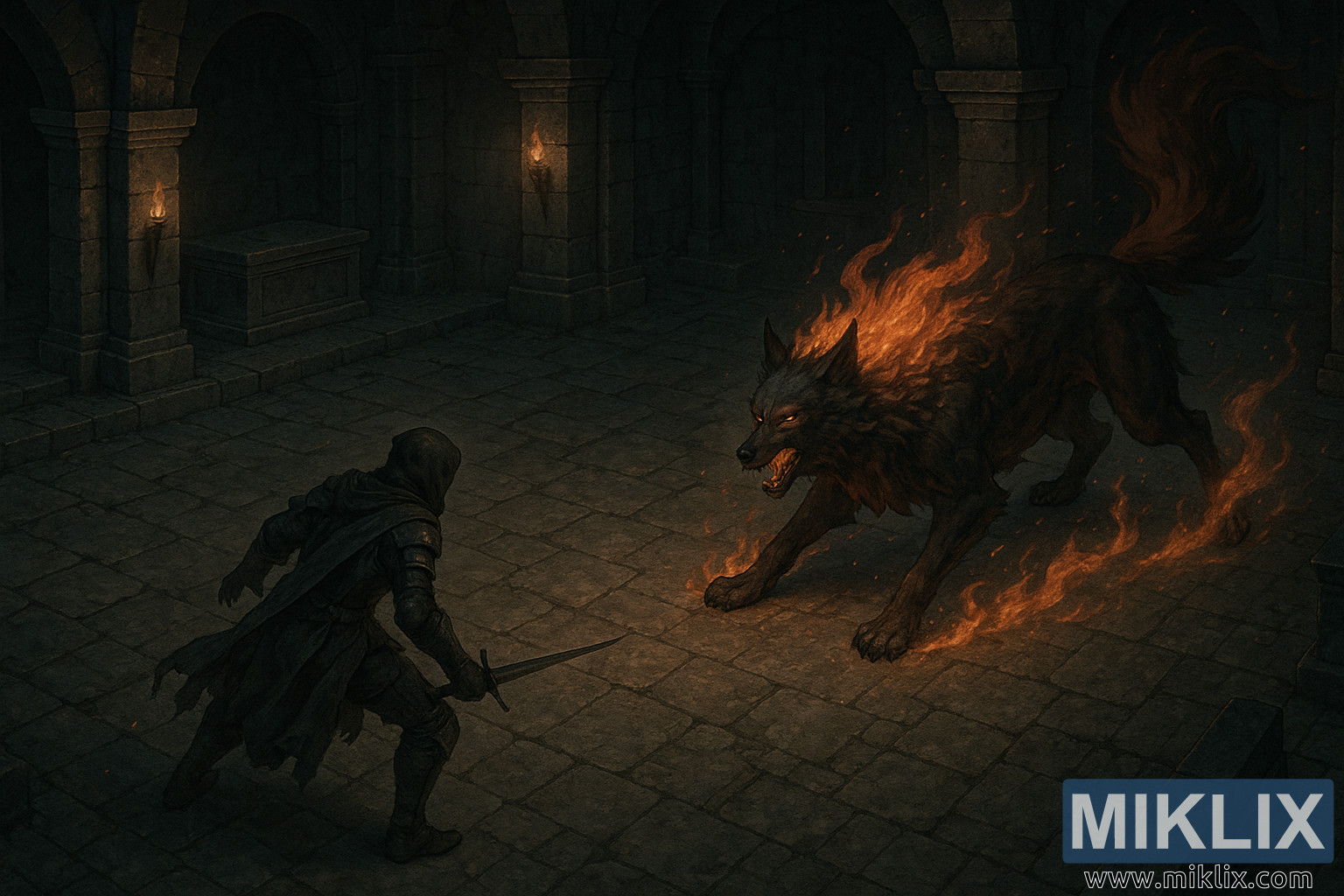 Mroczna, półrealistyczna ilustracja przedstawiająca Zmatowiałych walczących z ognistym Czerwonym Wilkiem w Grobowcu Bohatera Gelmiru, oświetlonym światłem pochodni i wirującymi żarzącymi się węglami.