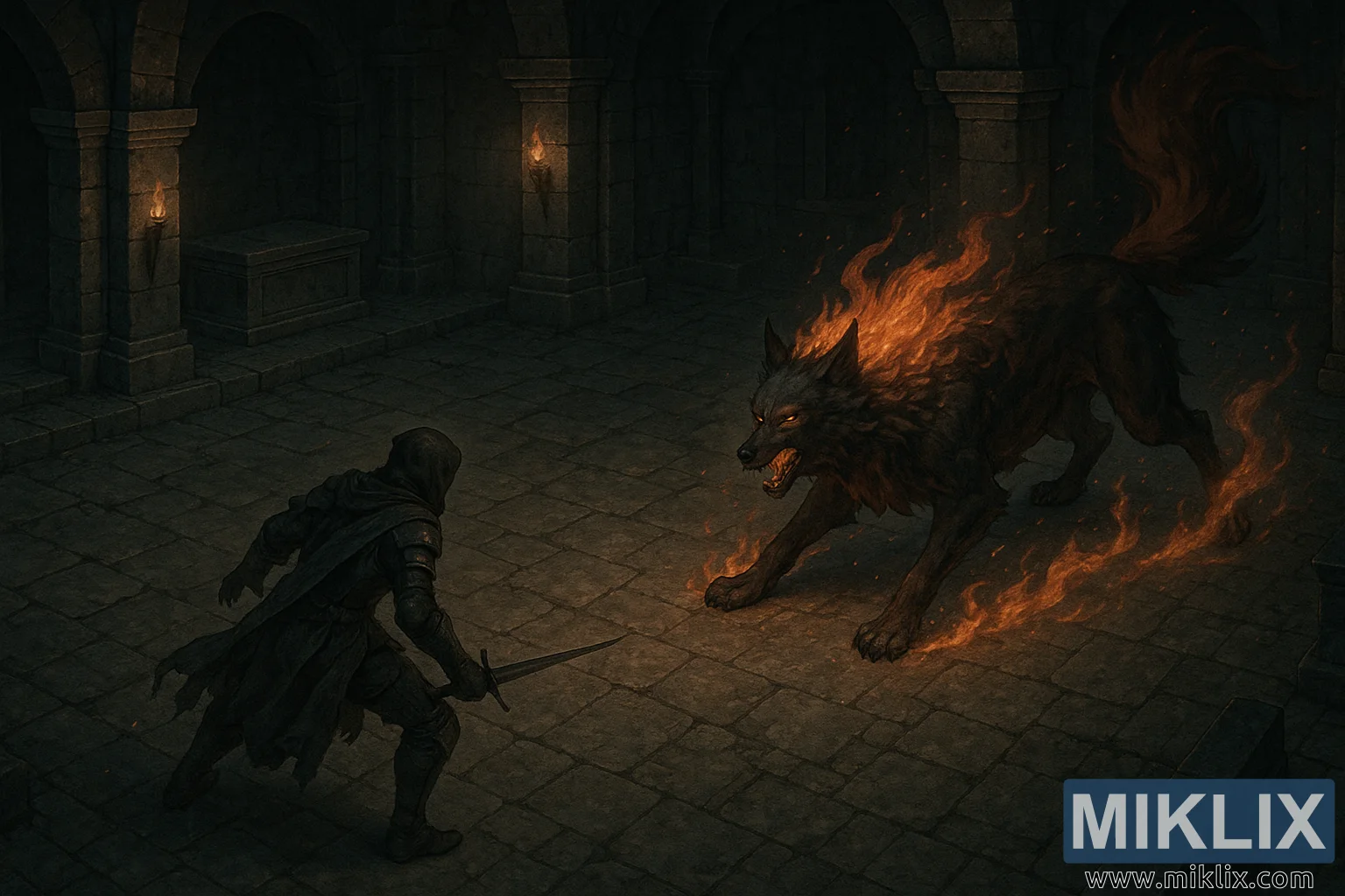 Naprzeciwko Tarnished, Czerwony Wilk Czempiona warczy, z ciałem nisko przy ziemi w agresywnym, terytorialnym geście. Półrealistyczne odwzorowanie uwydatnia muskulaturę pod ciemnym futrem wilka, a także ostre zarysy jego zębów i napięcie kończyn. Płomienie wybuchają na jego grzywie i ogonie, kaskadami warstwowych języków pomarańczy i żarzącej się czerwieni. Płomienie te stanowią główne źródło światła w scenie, rzucając kołyszące refleksy na kamienną posadzkę i powodując drżenie ostrych cieni wzdłuż filarów i ścian. Oczy wilka płoną roztopioną intensywnością – drapieżne, czujne i nieubłagane.