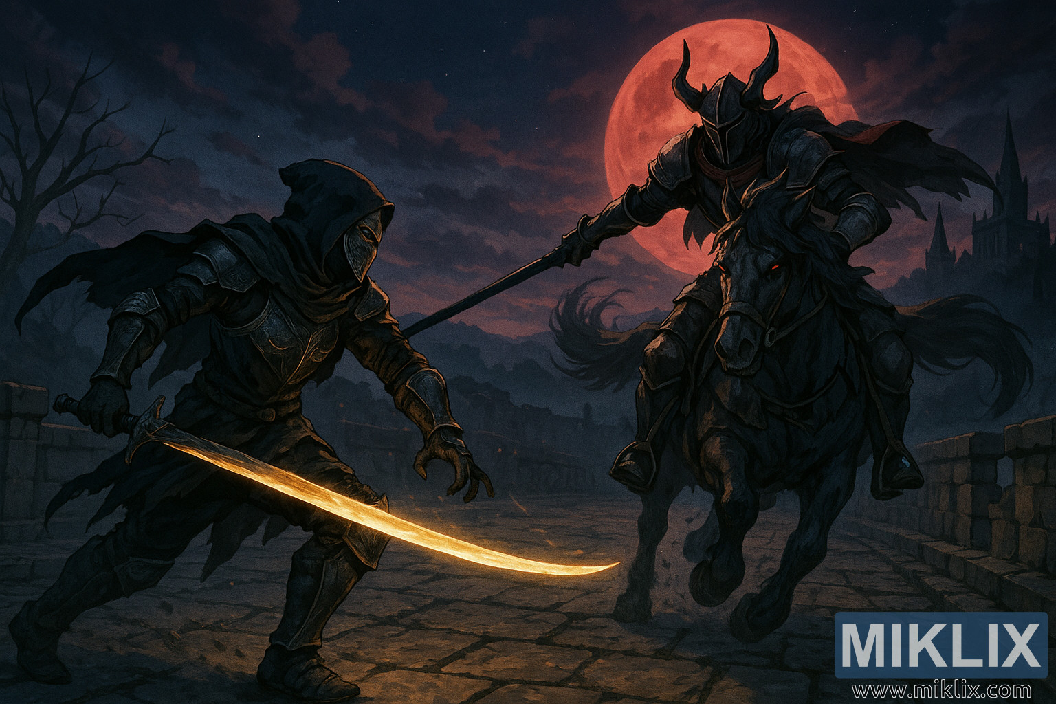 Obraz: Tarnished kontra Nocna Kawaleria na Moście Smoczego Barrow