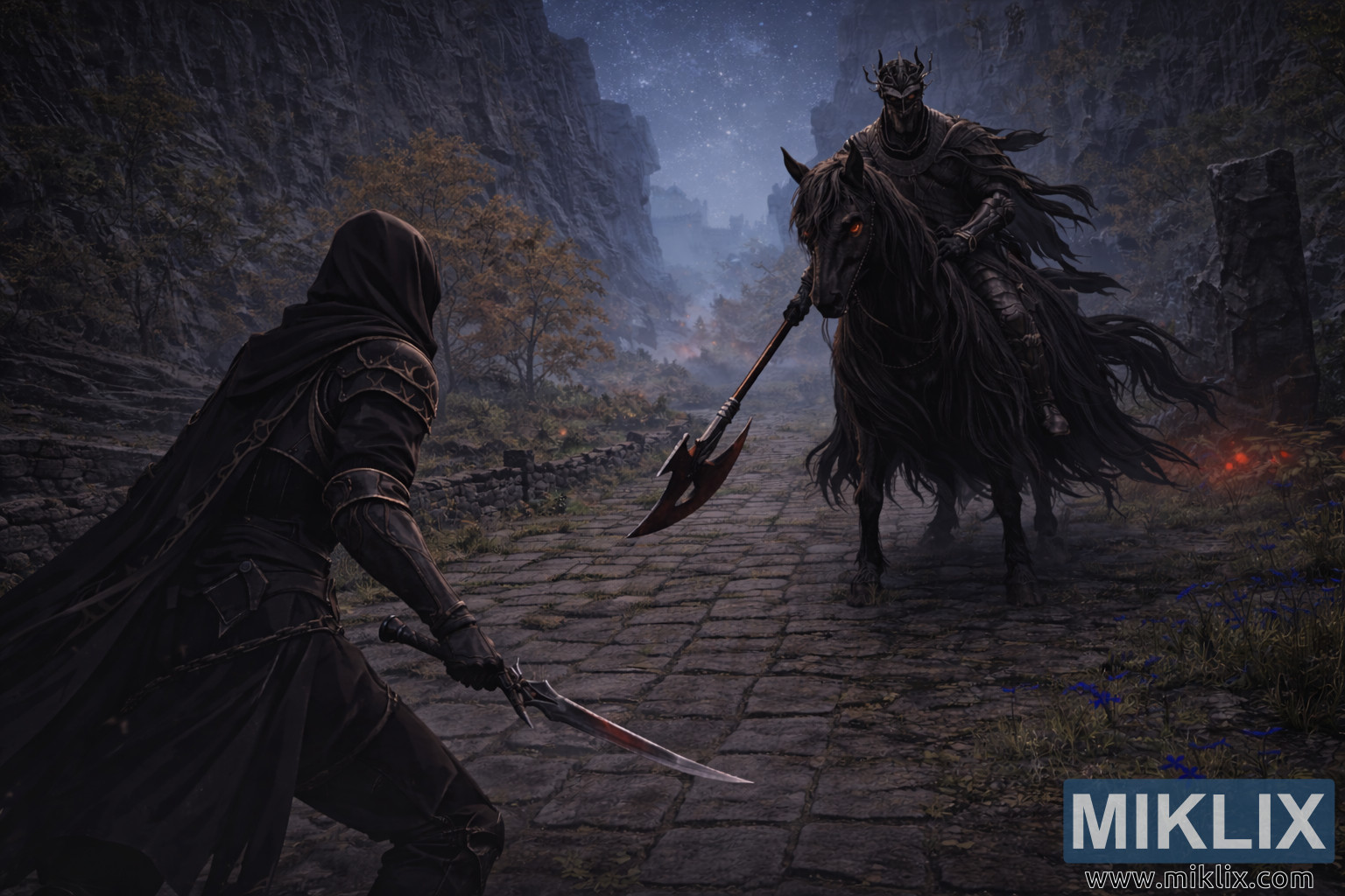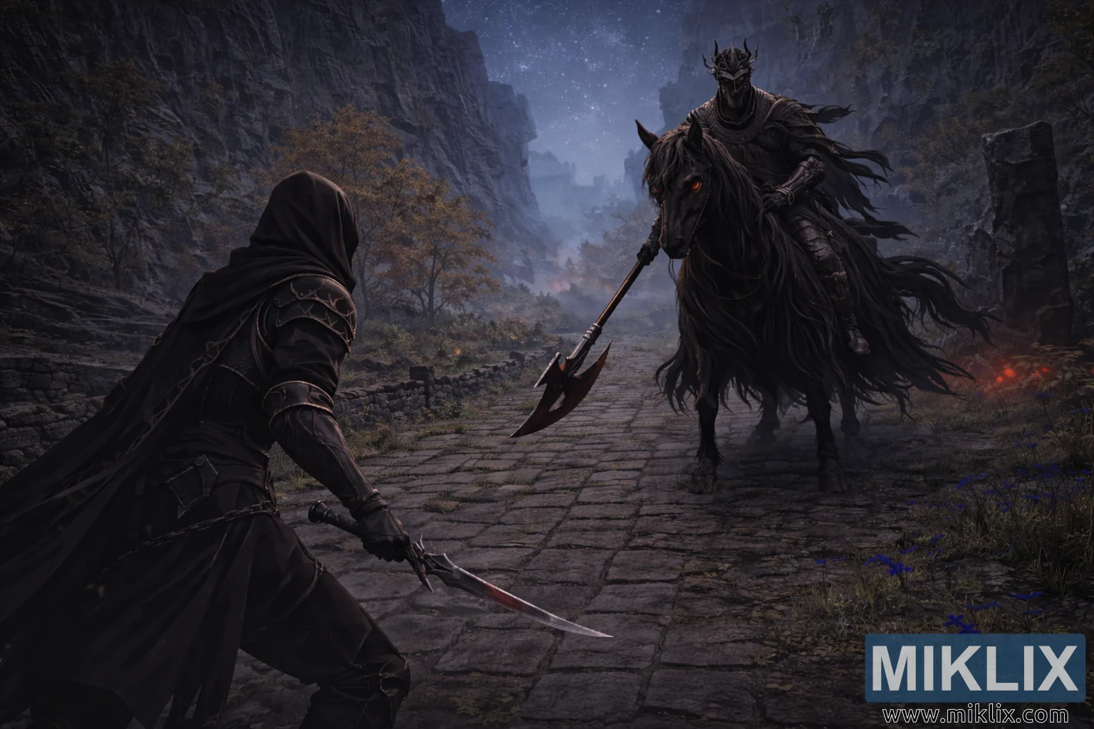 Naprzeciwko Tarnished, zajmując prawą stronę kadru i górując w rozszerzonym polu widzenia, stoi Nocna Kawaleria. Dosiadając ogromnego czarnego konia, boss dominuje nad sceną dzięki samej skali i obecności. Koń wygląda niemal nadprzyrodzenie, jego długa grzywa i ogon powiewają niczym pasma żywego cienia, a jego świecące czerwone oczy płoną w ciemności z drapieżną intensywnością. Nocna Kawaleria odziana jest w ciężką, kanciastą zbroję, która pochłania światło, tworząc surową sylwetkę na mglistym tle. Rogaty hełm wieńczy jeźdźca, nadając postaci demoniczny, nieziemski profil. Długą halabardę trzyma się ukośnie, jej ostrze unosi się tuż nad kamienną drogą, sygnalizując nieuchronną agresję powstrzymywaną jedynie przez oddech ciszy.