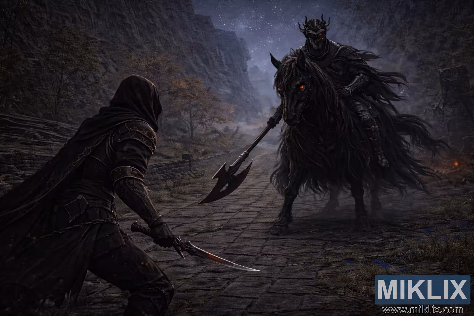 Ponad nimi nocne niebo pozostaje rozległe i usiane gwiazdami, rzucając zimne, niebieskoszare światło na scenę. W tle, słabe, ciepłe poświaty odległych żarzących się węgli i ledwo widoczna sylwetka fortecy wyłaniają się z warstw mgły, dodając głębi i narracyjnego kontekstu. Zwężona przestrzeń między Tarnished a Night's Cavalry sprawia, że emocjonalny rdzeń obrazu napina się, tworząc naładowany emocjami moment grozy i nieuchronności. Kompozycja uchwyca dokładną sekundę przed starciem – gdy wstrzymuje się oddech, napinają się mięśnie, a wynik wciąż jest niepewny.