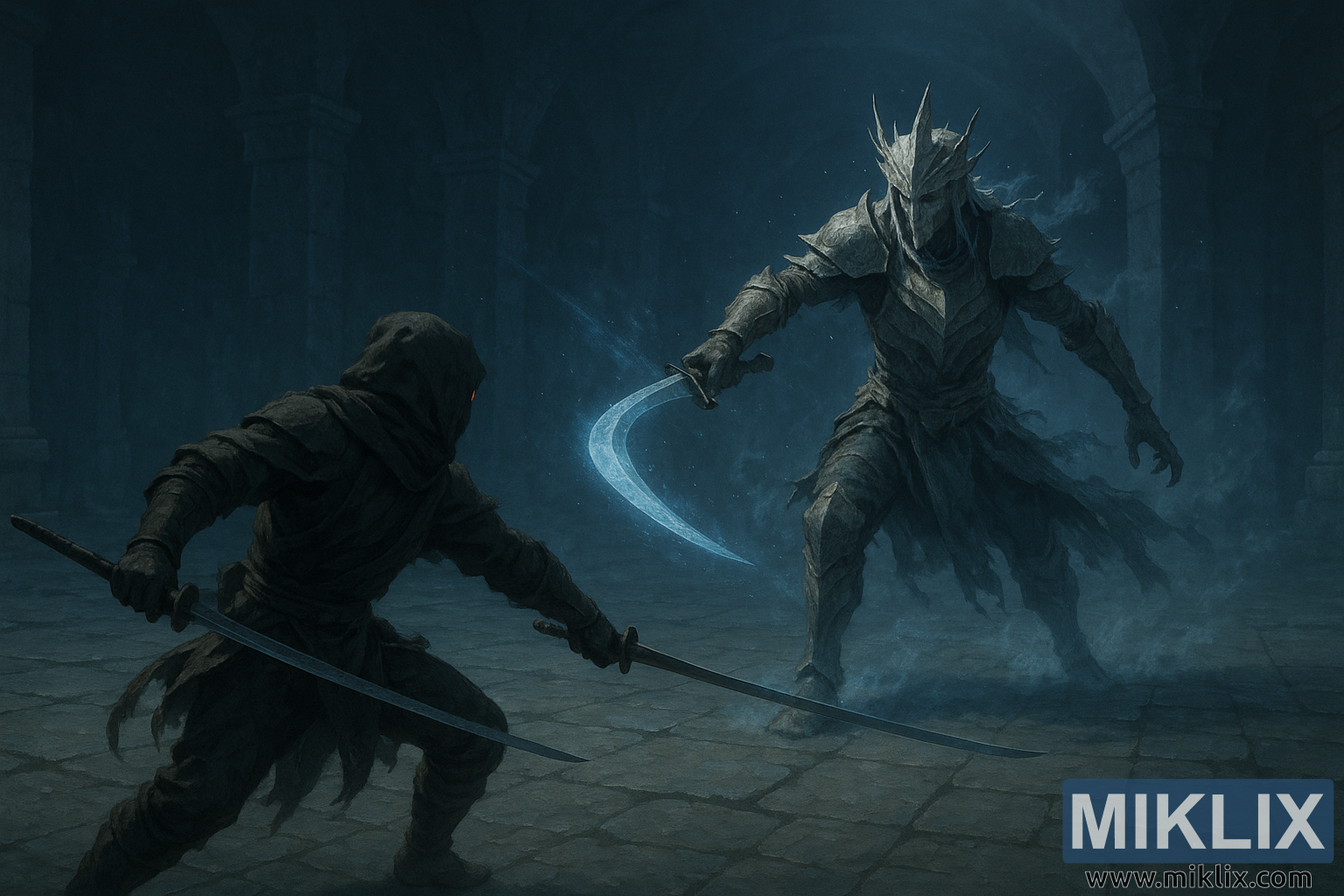 Postać gracza – odziana w kultową zbroję Czarnego Noża – znajduje się po lewej stronie, widziana częściowo od tyłu, w dynamicznej pozie, która sugeruje gwałtowny ruch. Zakapturzona postać pochyla się do przodu, z ugiętymi kolanami i lekko skręconym w lewo ciałem, przygotowując się do ataku lub uniku. Jej płaszcz i warstwowa zbroja naturalnie dopasowują się do ruchu, wykonane z teksturowanego, ciemnego materiału, który pochłania lodowate światło otoczenia. Spod kaptura bije tylko jedno czerwone oko, tworząc ostry kontrast wizualny z niebiesko-szarymi tonami. W obu dłoniach trzyma ostrze w stylu katany: lewe ostrze jest wyciągnięte do tyłu pod kątem obronnym, a prawe skierowane do przodu, nisko i gotowe do ataku. Oba miecze mienią się delikatnymi refleksami lodowo-niebieskiego światła, podkreślając ich ostrość i dynamikę.