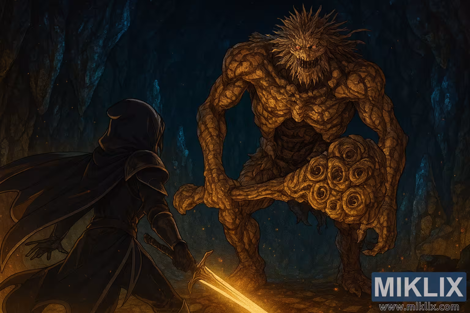 Ta fanowska grafika w wysokiej rozdzielczości, w stylu anime, przedstawia kulminacyjną bitwę w Elden Ring pomiędzy Tarnished a Stonedigger Troll, rozgrywającą się w mrocznych głębinach tunelu Old Altus. Kompozycja jest kinowa i dynamiczna, utrzymana w półrealistycznej estetyce anime, z dramatycznym oświetleniem i bogatymi teksturami.