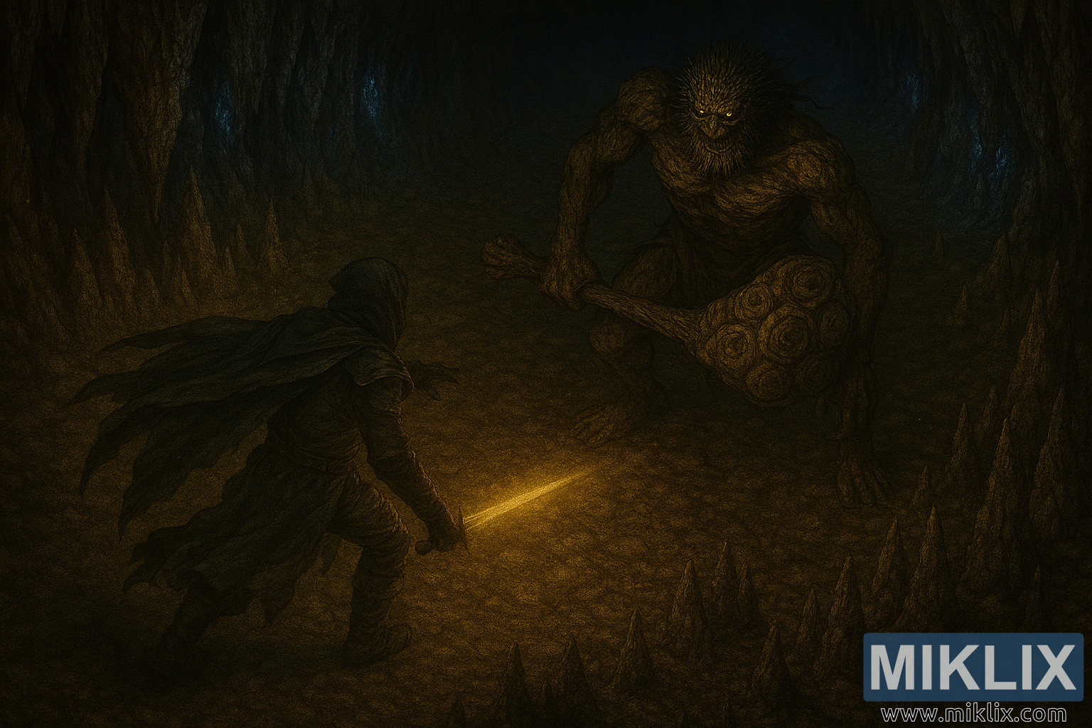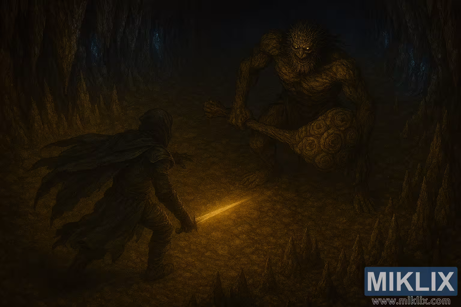 Naprzeciwko Tarnished, w prawym górnym kwadrancie, majaczy Troll Kopacz Kamienia – masywne, groteskowe stworzenie o ciele przypominającym skamieniałą korę i spękany kamień. Jego skóra jest głęboko pokryta bruzdami i szczelinami, a głowę wieńczą wypustki przypominające kolce. Oczy Trolla płoną złowrogim żółtym światłem, a jego paszcza jest wykrzywiona w grymas, odsłaniając ostre zęby. Jego muskularne kończyny są grube i sękate, a szponiaste stopy mocno osadzone na dnie jaskini. W prawej ręce dzierży kolosalną maczugę ozdobioną spiralnymi wzorami przypominającymi skamieniałości, uniesioną w gotowości do miażdżącego ciosu. Lewa ręka jest otwarta, z szponiastymi palcami zgiętymi w gotowości do ataku.