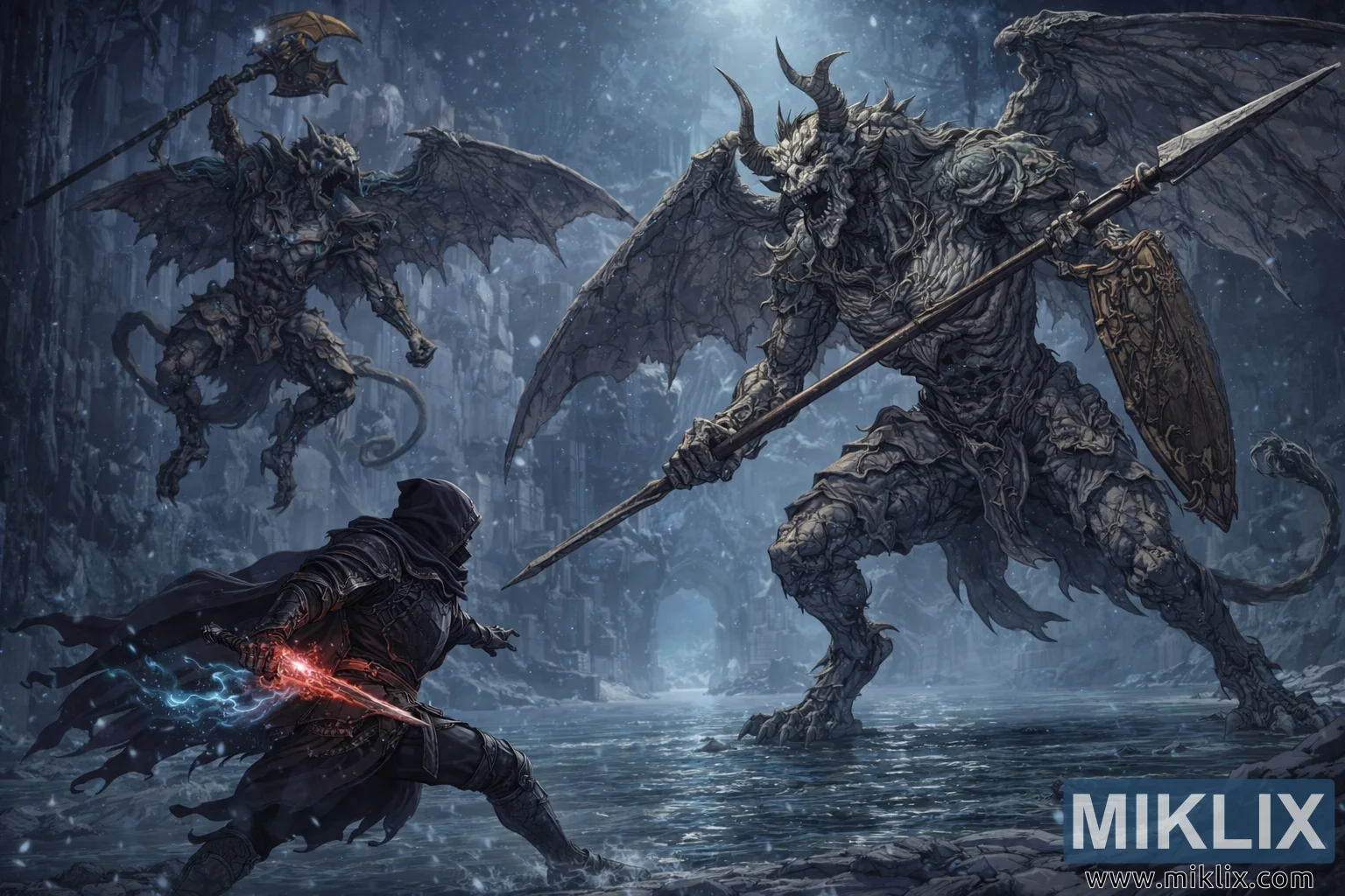 Drugi gargulec schodzi z lewego górnego rogu, jeszcze bardziej monstrualny w rozmiarach. Jego skrzydła są w pełni rozpostarte, rzucając na wodę potężny cień, gdy unosi nad głową kolosalny topór. Ogromną różnicę w rozmiarach między nim a Tarnished podkreśla perspektywa: bohater ledwo sięga gargulcowi do kolan, przez co bitwa zamienia się w desperacką walkę z istotami, które bardziej przypominają ruchome posągi niż istoty z krwi i kości.