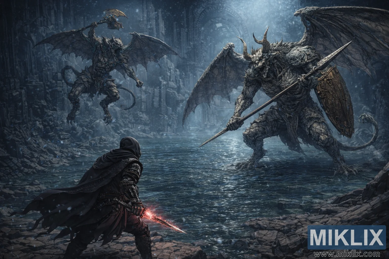 Przed nami, dominując nad kompozycją, majaczą dwa Dzielne Gargulce – teraz prawdziwie tytaniczne. Gargulec po prawej stronie tkwi po kolana w wodzie, a jego ogromne, kamienne ciało wznosi się niczym roztrzaskana wieża, przywrócona do życia. Pęknięcia na jego torsie przypominają pajęczynę, żyły starożytnej erozji wyżłobione w każdej warstwie skamieniałej skóry. Jego skrzydła rozciągają się na zewnątrz w postrzępionych, skórzastych rozpiętościach, które zdają się być zdolne przyćmić światło jaskini, podczas gdy długa broń drzewcowa jest wymierzona w Wytępionych z chirurgiczną grozą. U jego ramienia zwisa masywna, poobijana tarcza, bardziej zniszczona niż zbroja, o krawędziach wyszczerbionych i zniszczonych przez wieki przemocy.