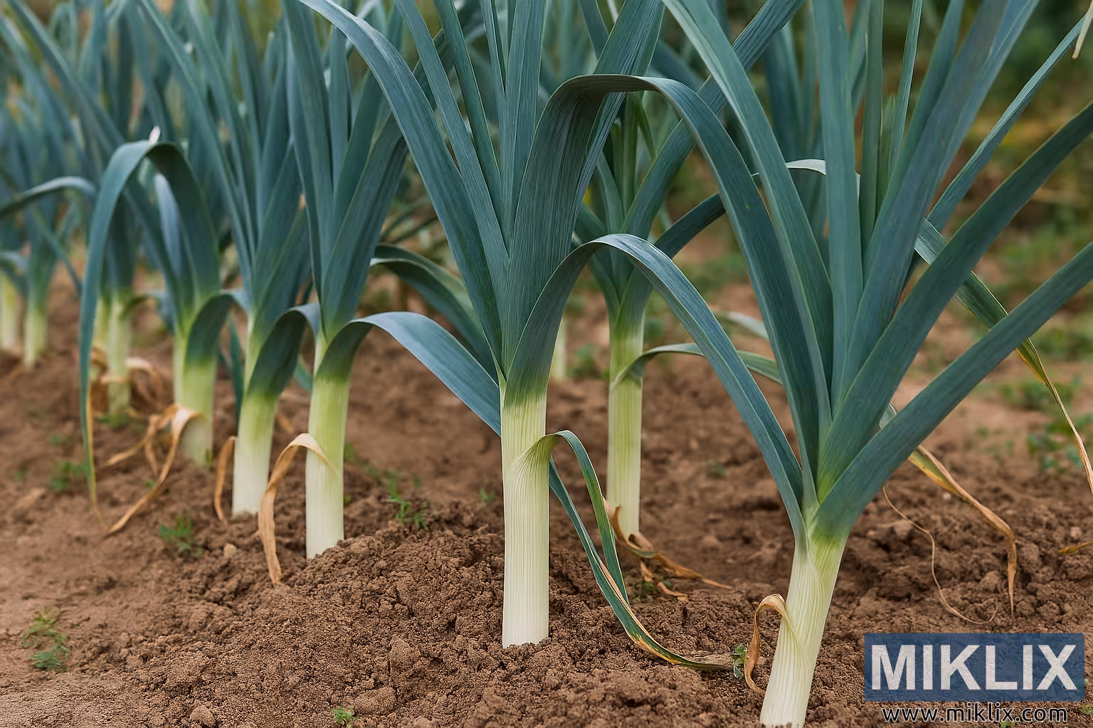 Wysokiej rozdzielczości zdjęcie zdrowych roślin pora rosnących w przydomowym ogrodzie, z białymi łodygami i zielonymi wierzchołkami w bogatej glebie.