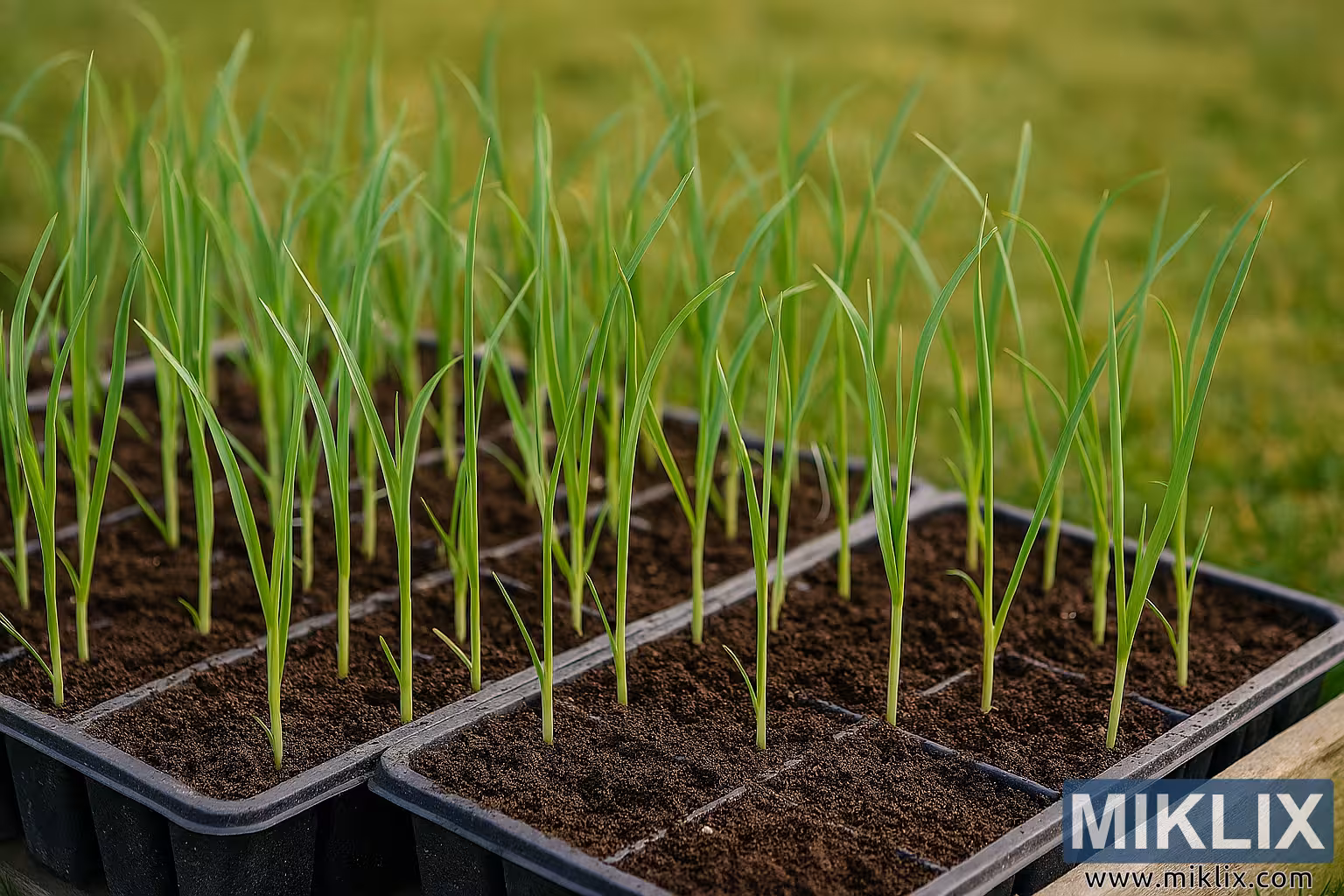 Zdjęcie krajobrazu w wysokiej rozdzielczości ukazuje z bliska sadzonki pora rosnące w czarnych plastikowych tackach, ułożone w równych rzędach na zwietrzałej drewnianej powierzchni na zewnątrz. Każda tacka zawiera kilka przegródek wypełnionych ciemną, wilgotną glebą, podtrzymujących pojedyncze sadzonki pora we wczesnej fazie wegetacji. Sadzonki mają długie, smukłe, wyprostowane liście o gładkiej fakturze i subtelnym, równoległym unerwieniu. Kolor waha się od jasnozielonego u podstawy do ciemnozielonego na końcach, co wskazuje na prawidłowy rozwój chlorofilu i silny wzrost.