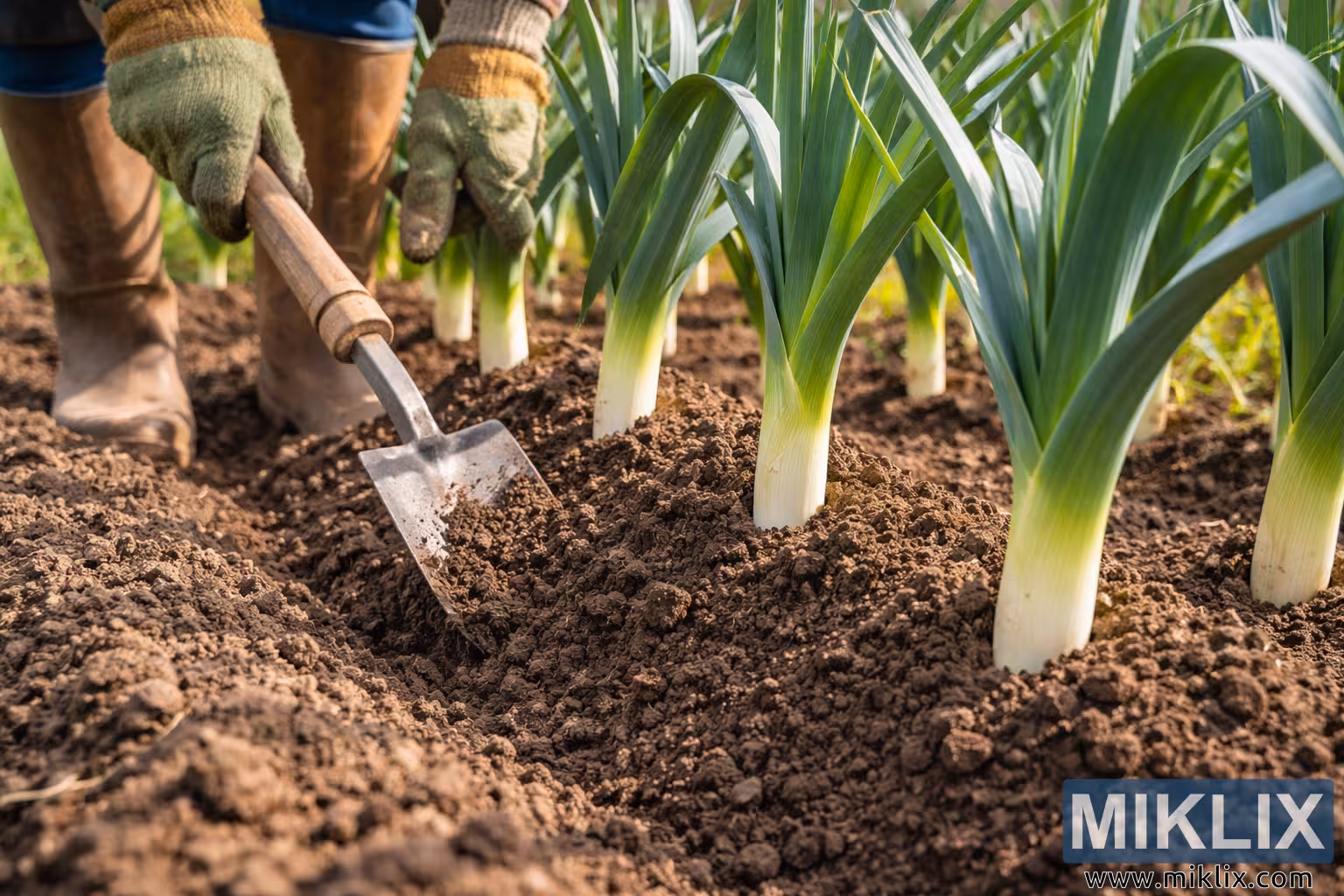 Zdjęcie przedstawia szczegółowy widok z poziomu gruntu, ukazujący ogrodnika demonstrującego tradycyjną technikę blanszowania porów poprzez usypywanie kopczyków ziemi wokół łodyg. Scena rozgrywa się w zadbanym ogrodzie warzywnym, w ciepłym, naturalnym świetle słonecznym, które delikatnie rozświetla glebę i liście. Na pierwszym planie mała metalowa motyka z drewnianym trzonkiem wbija się pod kątem w luźną, ciemną ziemię, a jej ostrze jest częściowo zakopane, gdy gleba jest wciągana do środka, w kierunku podstawy roślin. Dłonie ogrodnika, chronione przez znoszone, poplamione ziemią rękawice materiałowe, mocno ściskają narzędzie, co świadczy zarówno o staranności, jak i wprawnej znajomości zadania. Widoczna jest tylko dolna część ogrodnika, co podkreśla bardziej pracę niż osobę; solidne pomarańczowe gumowe buty stoją posadzone między rzędami, ich powierzchnie zmatowiałe od użytkowania i pokryte ziemią. Równomiernie rozmieszczone pory rozciągają się równoległymi liniami w tło, tworząc wrażenie porządku i głębi. Każdy por ukazuje wyraźny kontrast między jasną, wydłużoną dolną łodygą a szerokimi, wyprostowanymi, zielonymi liśćmi powyżej. Gleba została starannie usypana wokół dolnych partii łodyg, co ilustruje cel bielenia: ochronę łodyg przed światłem, dzięki czemu pozostaną delikatne, łagodne i białe w miarę wzrostu. Tekstura ziemi jest szczególnie wyrazista, z małymi grudkami, drobnymi ziarnami i subtelnymi cieniami zdradzającymi niedawną uprawę. Światło słoneczne przesącza się przez liście, tworząc delikatne odcienie zieleni i żółci, sugerując spokojny, produktywny moment w sezonie wegetacyjnym. Perspektywa umieszcza widza na wysokości rośliny, niemal w rzędzie, dzięki czemu akcja wydaje się bezpośrednia i pouczająca. W kadrze nie ma żadnych zbędnych elementów ani rozpraszaczy; zamiast tego kompozycja koncentruje się na relacji między narzędziem, glebą i rośliną. Powtarzające się łodygi pora cofające się w oddali wzmacniają ideę rutynowej pielęgnacji ogrodu, wykonywanej starannie przez lata. Ogólnie rzecz biorąc, zdjęcie jest zarówno ilustracją rolnictwa, jak i cichym, namacalnym portretem praktycznej produkcji żywności, podkreślającym cierpliwość i uwagę potrzebną do uprawy warzyw od podstaw.