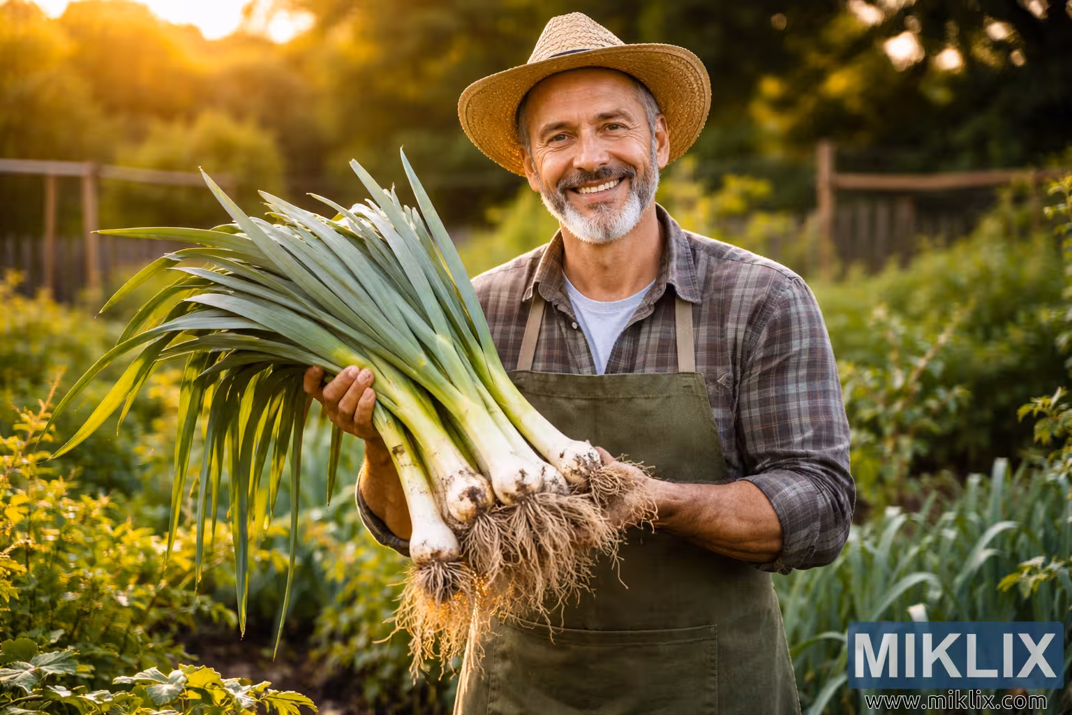 Dumny ogrodnik stoi w bujnym ogrodzie, trzymając świeżo zebrane pory, uchwycone w ciepłym, naturalnym świetle, które podkreśla zrównoważony styl życia i radość z uprawy żywności.