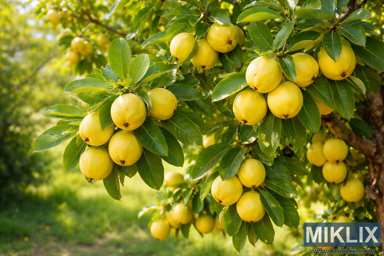 Wysokiej rozdzielczości zdjęcie krajobrazu przedstawiające drzewo guawy cytrynowej rodzące mnóstwo dojrzałych żółtych owoców, otoczone intensywnie zielonymi liśćmi w naturalnym otoczeniu.