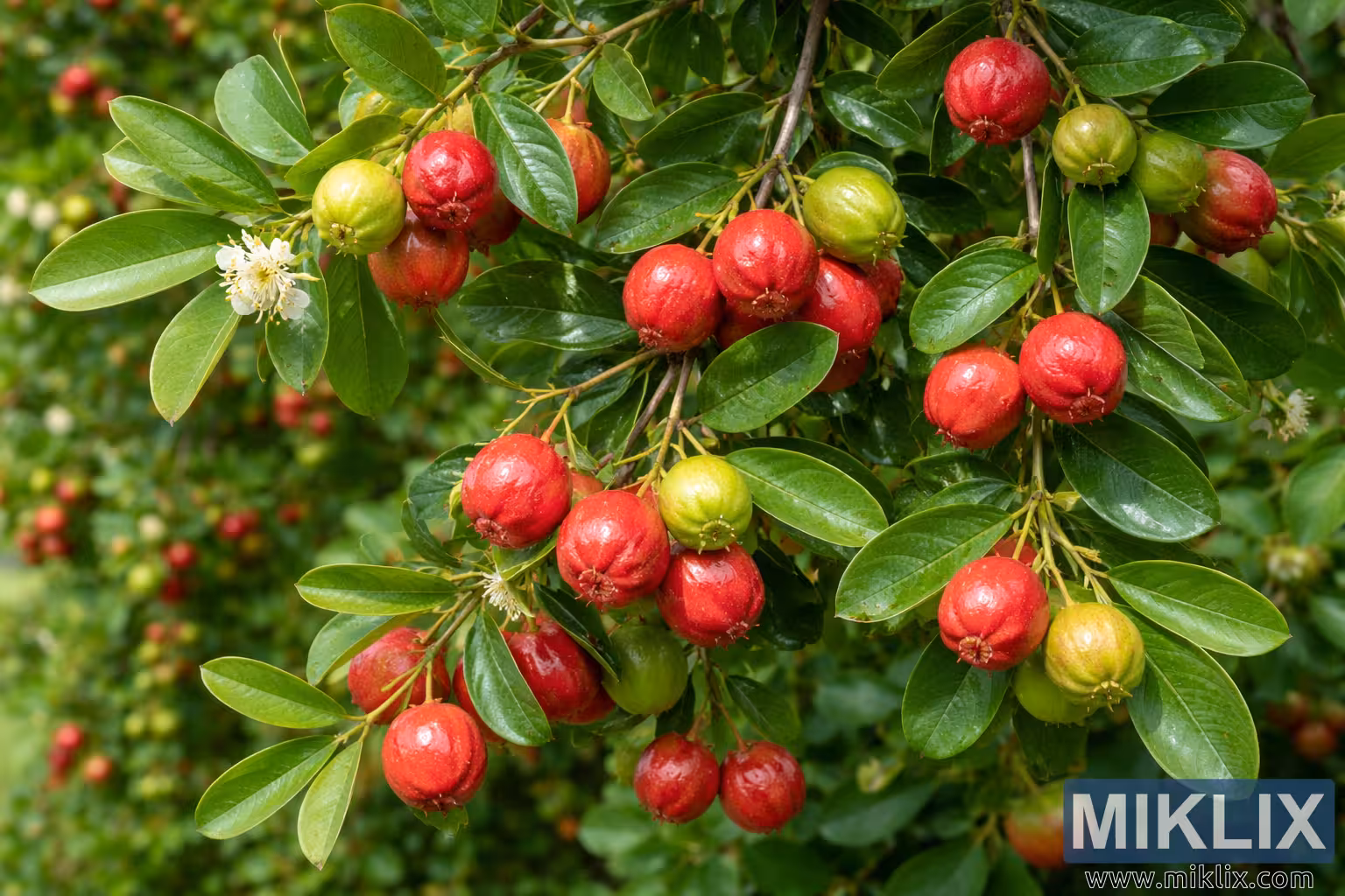 Zdjęcie przedstawia bujne drzewo guawy truskawkowej, uchwycone na wysokiej rozdzielczości, krajobrazowej fotografii, która podkreśla naturalną obfitość i botaniczne detale. Liczne smukłe gałęzie rozciągają się ukośnie przez kadr, każda gęsto pokryta gładkimi, owalnymi liśćmi w bogatych odcieniach głębokiej zieleni. Liście wydają się grube i woskowe, odbijając miękkie, naturalne światło, które podkreśla ich lśniącą powierzchnię i wyraźnie zaznaczone żyłki. Pośród liści rozsiane są kiście owoców guawy truskawkowej w różnym stadium dojrzałości, tworząc żywy kontrast kolorów na całym zdjęciu. W pełni dojrzałe owoce dominują na scenie, prezentując nasycony, karmazynowy do rubinowoczerwonego odcień z subtelnie pomarszczoną skórką, podczas gdy mniej dojrzałe owoce pojawiają się w odcieniach od jasnozielonego do żółtozielonego, wskazując na postęp wzrostu drzewa. Owoce są okrągłe lub lekko owalne i zwisają w małych grupach, niektóre ściśnięte razem, inne zwisają pojedynczo z cienkich łodyg. Ich teksturowana skórka odbija światło, nadając im świeży, lekko zroszony wygląd, sugerujący niedawny deszcz lub poranną wilgoć. Pośród owoców rozsiane są delikatne, białe kwiaty z delikatnymi, promienistymi pręcikami zakończonymi jasnożółtym kolorem, co dodaje subtelnego i misternego detalu, kontrastującego z wyrazistymi kolorami owoców. Tło jest delikatnie rozmyte, złożone z większej ilości zieleni i liści, co pomaga skupić uwagę na głównych gałęziach i gronach owoców na pierwszym planie, jednocześnie oddając wrażenie kwitnącego sadu lub tropikalnego ogrodu. Ogólnie rzecz biorąc, zdjęcie oddaje witalność, naturalne bogactwo i produktywne piękno drzewa guawy truskawkowej, łącząc botaniczną precyzję z zachęcającym, niemal namacalnym realizmem, który pozwala widzowi wyobrazić sobie zapach, fakturę i świeżość sceny.