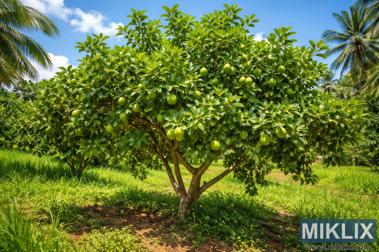 Zdjęcie przedstawia zdrowe drzewo guawy, rosnące w idealnym, tropikalnym środowisku, w pełnym słońcu. Drzewo stoi w centrum kompozycji, szeroko rozpostarte, z niską, zaokrągloną koroną, gęstą i symetryczną. Jego pień jest mocny i lekko rozgałęziony u podstawy, podtrzymując liczne, łukowato wygięte konary, które rozciągają się na zewnątrz i w dół, co jest charakterystyczne dla dojrzałego, dobrze utrzymanego drzewa guawy. Kora jest gładka lub lekko teksturowana, w naturalnych odcieniach brązu i szarości, subtelnie podkreślonych przez bezpośrednie światło słoneczne.