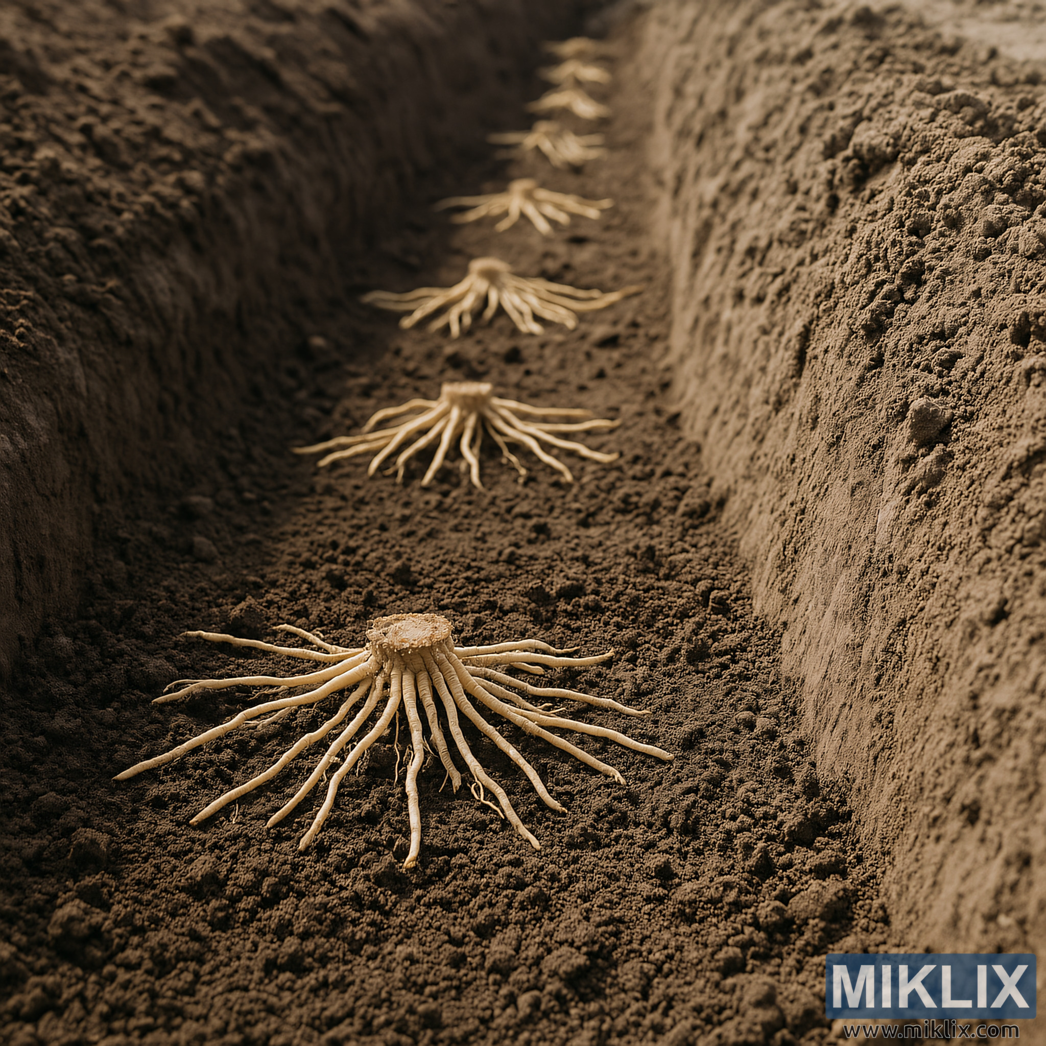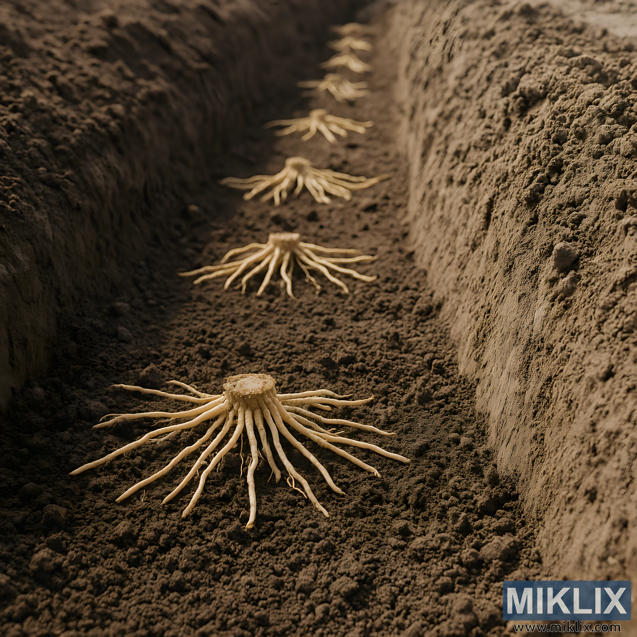 Każda korona szparaga spoczywa bezpośrednio na dnie wykopu, tak aby centralna korona – lub skupisko pąków – była wyprostowana i wyraźnie widoczna. Korony wykazują charakterystyczną strukturę zdrowych sadzonek szparaga: zwartą, jasnobrązową, lekko guzowatą masę centralną, z której wyrastają długie, smukłe, kremowe korzenie, niczym szprychy koła. Korzenie te są rozłożone, a nie zbite w kępy lub splątane, co świadczy o prawidłowej technice sadzenia, która sprzyja silnemu ukorzenieniu i równomiernemu pobieraniu składników odżywczych. Odstępy między koronami są stałe, co zapewnia przyszłym pędom odpowiednią ilość miejsca do wzrostu bez przepełnienia.
