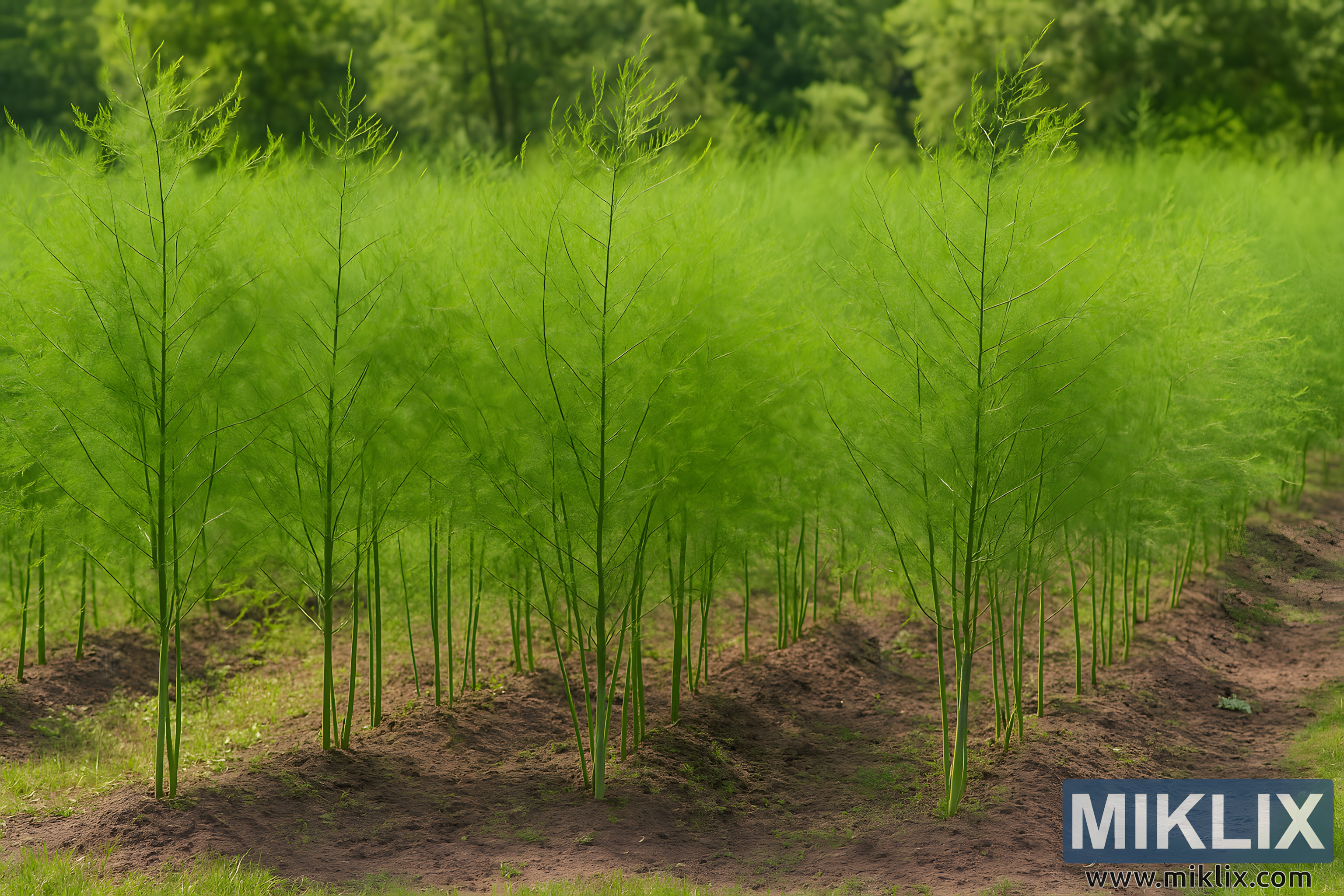 Tle, delikatnie skupiona grupa dojrzałych drzew dodaje głębi i kontekstualizuje grządkę szparagów w szerszym, naturalnym otoczeniu. Ich głębsza, ciemniejsza zieleń tworzy wielowarstwowy gradient kolorów, który pozwala liściom szparagów na pierwszym planie jeszcze bardziej się wyróżnić. Oświetlenie jest rozproszone i równomierne, sugerując spokojny, letni dzień z łagodnym słońcem.