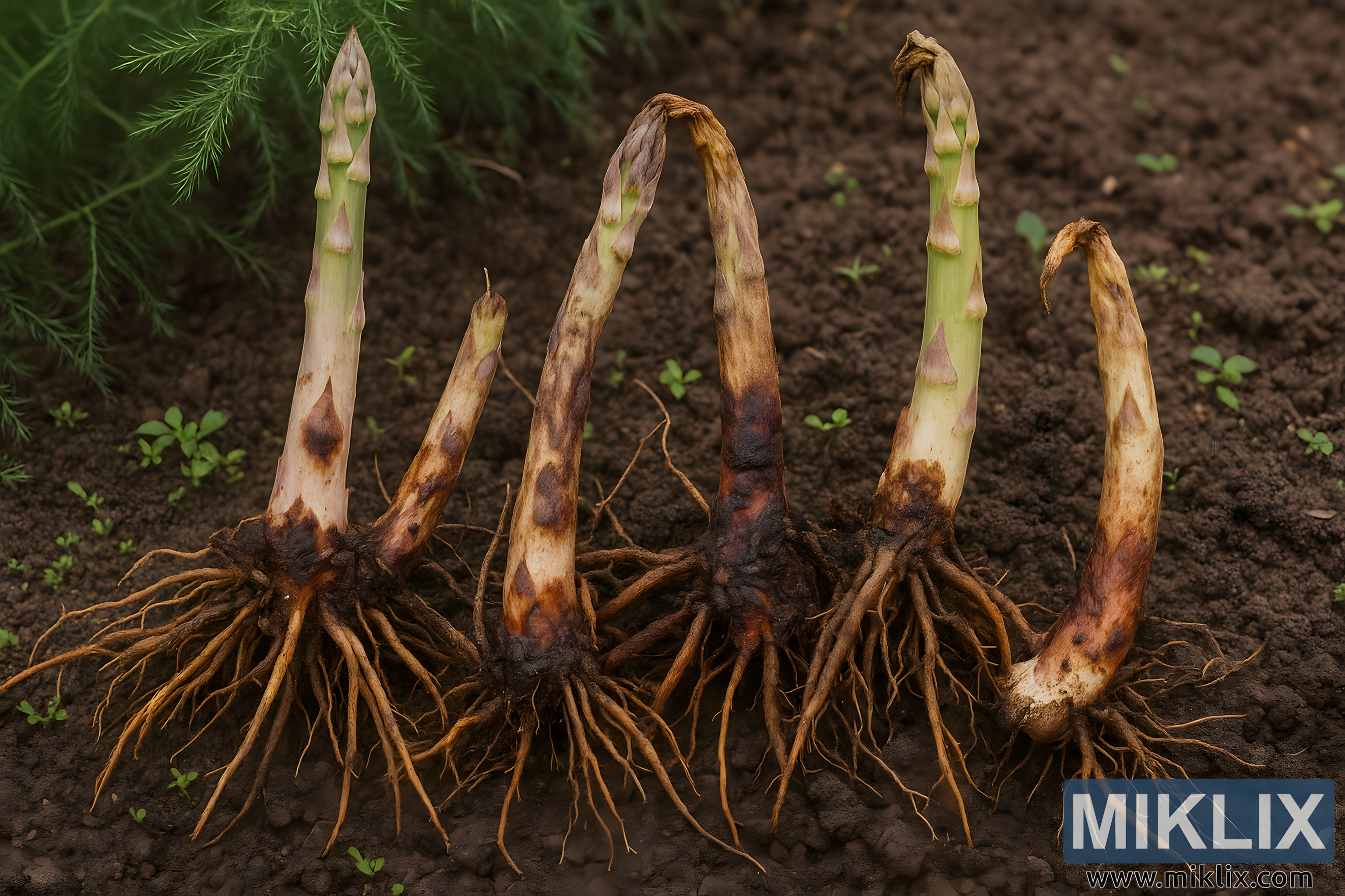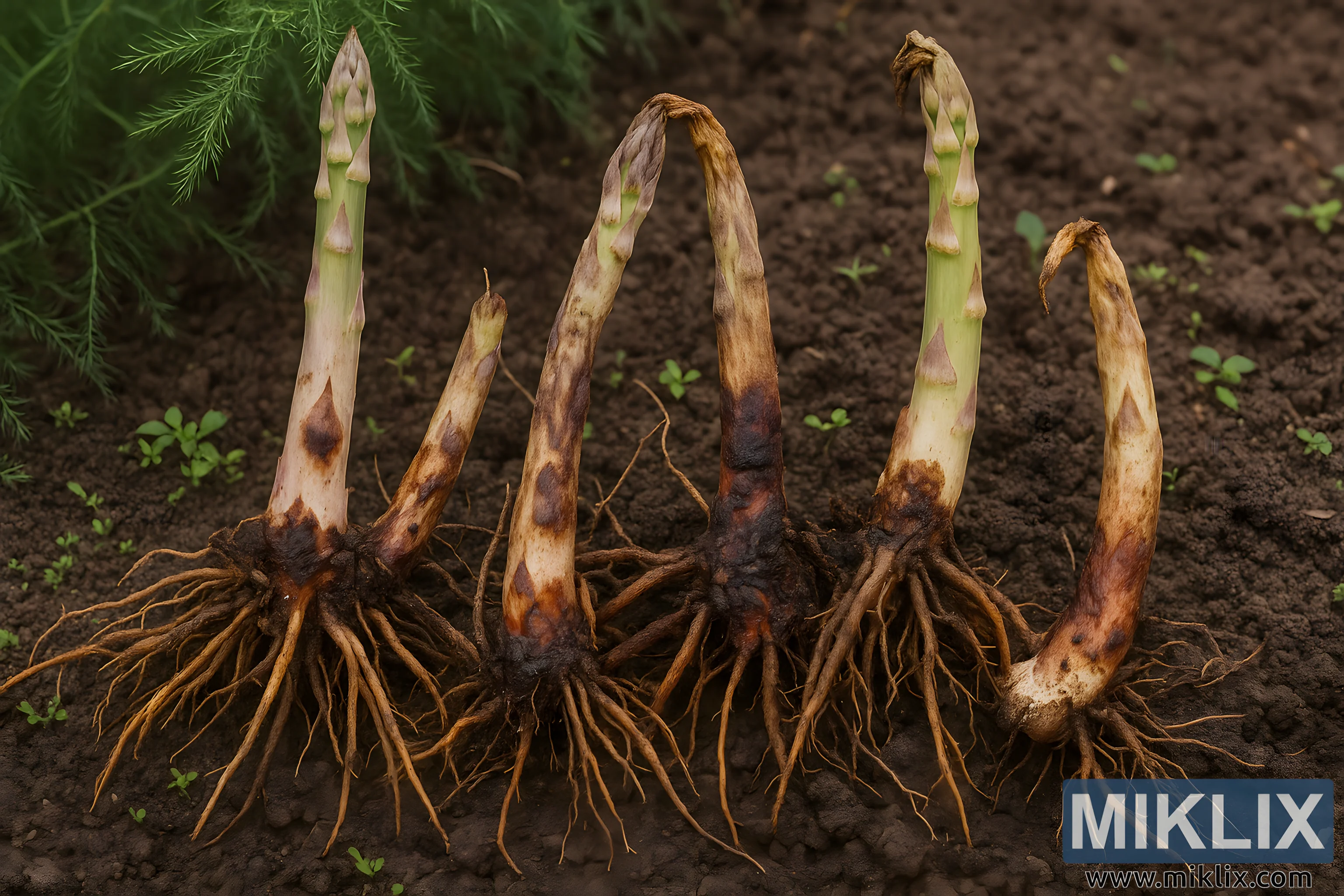 Obraz: Szparagi z Fusarium i zgnilizną korzeni w glebie ogrodowej