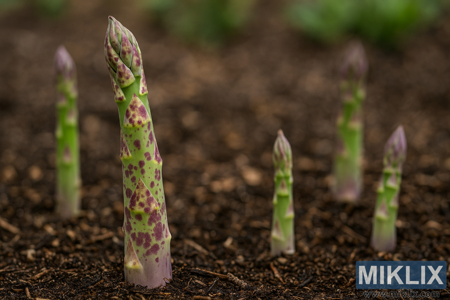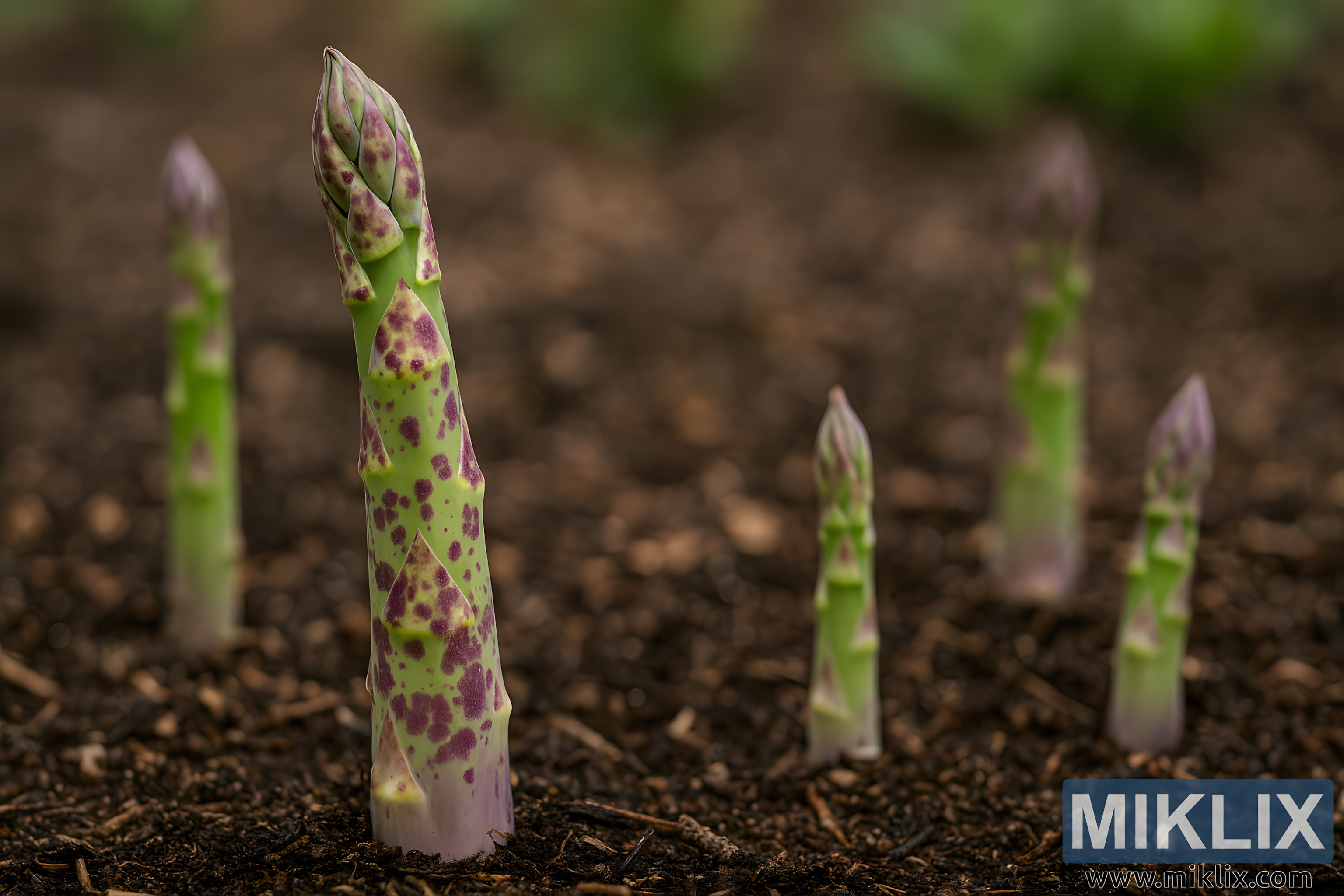 Obraz: Włócznie szparagów z fioletowymi plamami na grządce ogrodowej