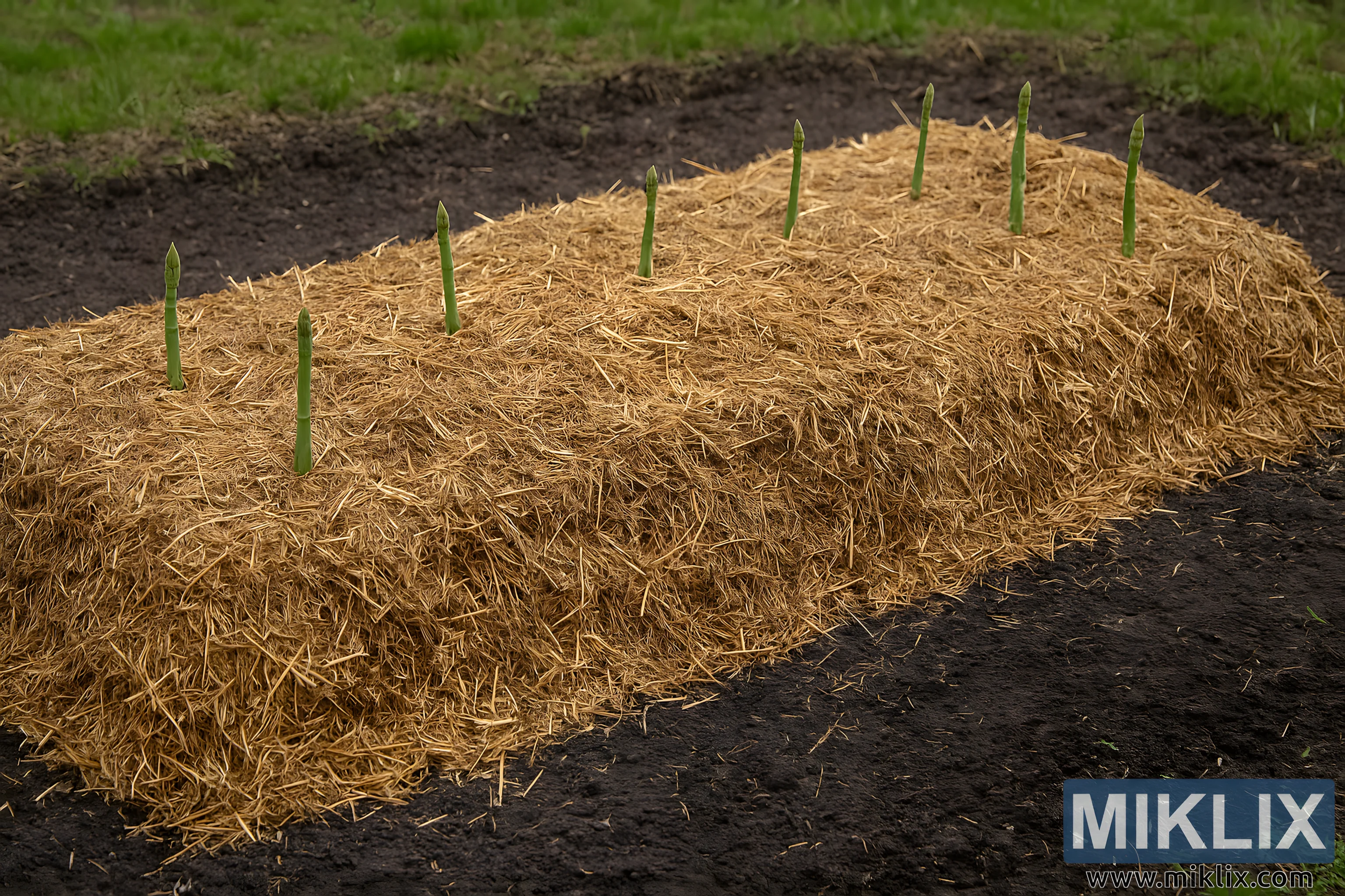 Zdjęcie emanuje porządkiem, przygotowaniem i naturalną harmonią. Słomiana ściółka zachowuje ciepły kolor, sugerując, że jest czysta i wolna od pleśni lub nadmiernej wilgoci, co idealnie nadaje się do zimowego okrycia. Pędy szparagów – wyprostowane i żywe – świadczą o zdrowiu i dobrym utrzymaniu grządki. Pozioma orientacja zdjęcia zapewnia przestronny widok na całą grządkę, pozwalając widzowi docenić zarówno równomierne rozłożenie ściółki, jak i uporządkowany układ rosnących szparagów. Ogólnie rzecz biorąc, scena odzwierciedla najlepsze praktyki w zakresie zimowania grządek ze szparagami, podkreślając znaczenie ściółki zarówno dla ochrony, jak i zdrowia gleby, gdy ogród przechodzi w chłodniejszą porę roku.