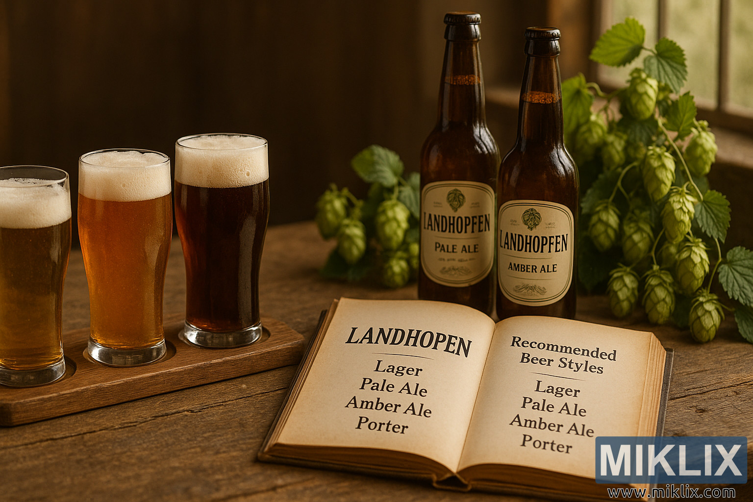 Na środku, tuż za degustacją, stoją dwie butelki piwa Landhopfen, których etykiety wyraźnie przedstawiają symbol chmielu i styl piwa – „Pale Ale” i „Amber Ale”. Butelki mają lekko postarzany, rzemieślniczy wygląd, z stonowanymi, ziemistymi tonami, które harmonizują z ogólną rustykalną scenerią. Pomiędzy butelkami a degustacją leży otwarty dziennik piwny vintage, którego strony są lekko pomarszczone i naznaczone patyną wieku. Dziennik otwiera się na rozkładówce zatytułowanej na dwóch przeciwległych stronach. Na lewej stronie, pogrubioną czcionką szeryfową, widnieje napis „LANDHOPFEN”, a następnie wyśrodkowana lista: Lager, Pale Ale, Amber Ale, Porter. Na prawej stronie, nagłówek „Rekomendowane style piwa” powtarza tę samą listę, jakby dziennik był przewodnikiem piwowara, szczegółowo opisującym, które style najlepiej oddają charakter tej tradycyjnej niemieckiej odmiany chmielu. Czysta, wyważona typografia i faktura postarzanego papieru przywodzą na myśl starodawne poczucie rzemieślniczej wiedzy przekazywanej z pokolenia na pokolenie.
