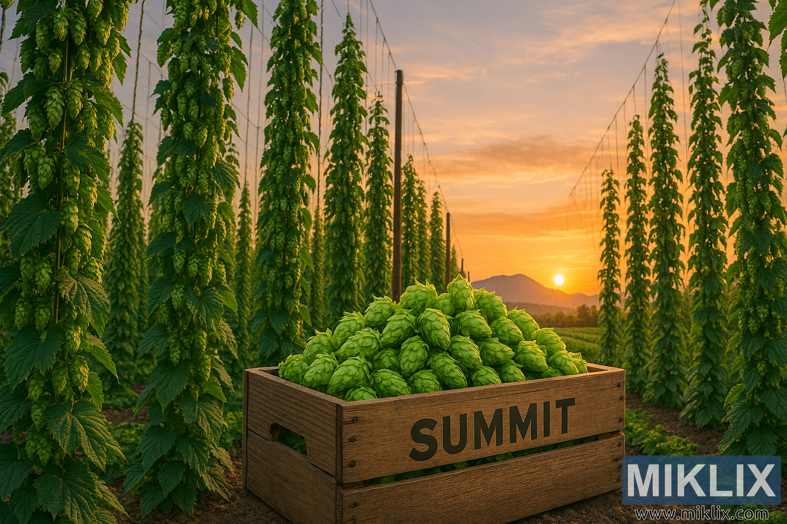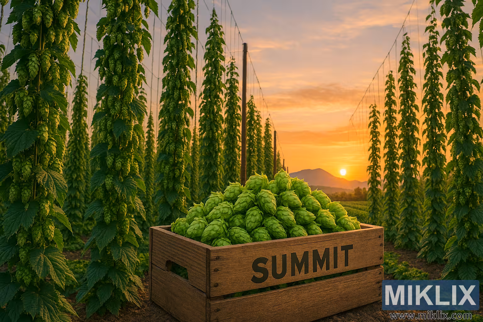 Prawym dolnym rogu, rustykalna, drewniana skrzynia z napisem „SUMMIT” wytłoczonym pogrubioną czarną czcionką, częściowo osadzona w żyznej glebie. Skrzynia jest wypełniona po brzegi świeżo zebranymi szyszkami chmielu Summit, których jasnozielony odcień kontrastuje z ziemistymi tonami starego drewna. Każda szyszka jest pulchna i ma fakturę, co sugeruje najwyższą świeżość i moc aromatu. Umiejscowienie skrzyni dodaje namacalnego, ludzkiego elementu do rozległego, rolniczego otoczenia.