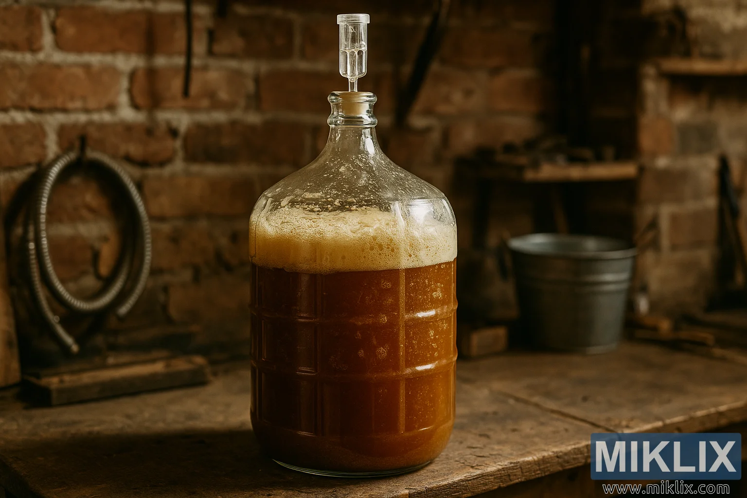 Composição geral evoca a natureza paciente e prática da produção caseira de cerveja. Captura um momento entre os processos — após a transferência do mosto e a adição do fermento, mas antes da maturação ou do engarrafamento — quando a transformação de ingredientes simples em cerveja está em andamento. As paredes transparentes do garrafão convidam o observador a contemplar a química viva em seu interior, onde as células de levedura convertem açúcares em álcool e dióxido de carbono, visíveis através da efervescência e da espuma. A cena transmite uma energia tranquila, quase meditativa, sublinhada pelo contraste entre a atividade orgânica e a quietude do ambiente rústico.