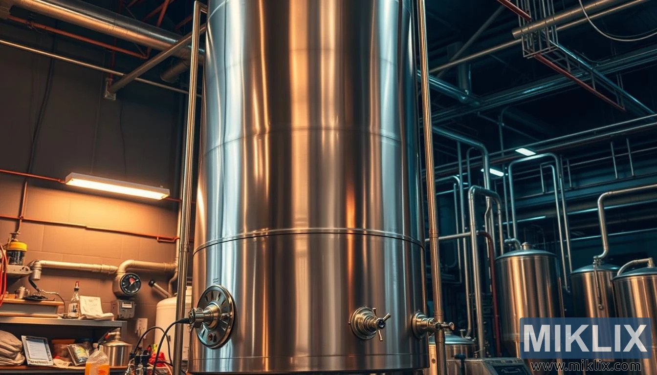 Um imponente fermentador de aço inoxidável com válvulas e portas em uma cervejaria comercial, simbolizando precisão e produção de cerveja em larga escala.