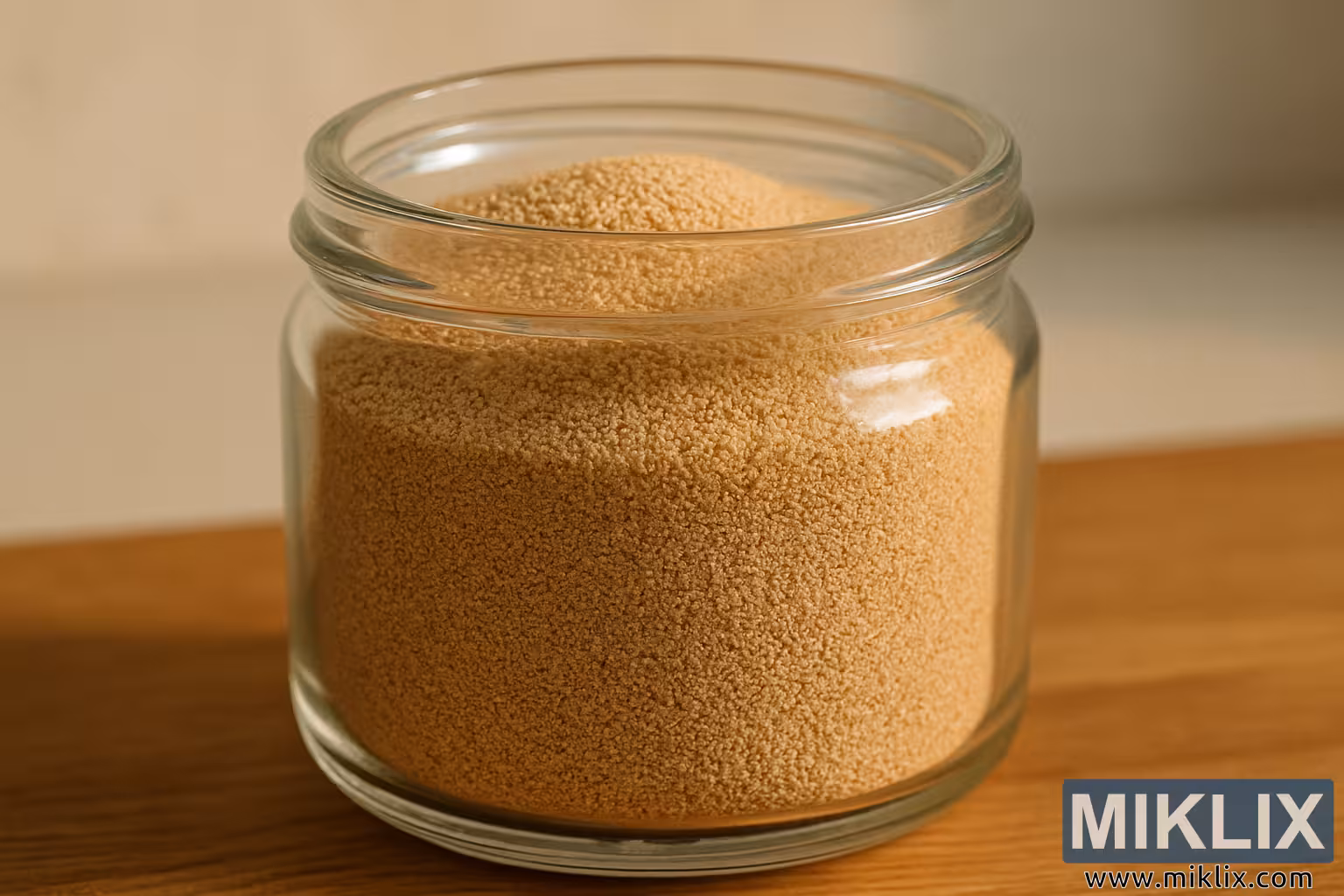 superfície da levedura, especialmente onde ela encontra a luz, exibe um brilho delicado, sugerindo a natureza seca e levemente cristalina das partículas individuais. Esse brilho sutil contrasta com a textura macia e fosca do material a granel, criando interesse visual. A iluminação natural e quente que banha a cena é um elemento crucial, realçando o apelo visual e realçando a cor e a textura diferenciadas da levedura. A luz incide predominantemente do canto superior esquerdo, criando destaques suaves na borda do copo e na superfície da levedura, ao mesmo tempo em que projeta sombras suaves e superficiais na massa granular. Essa interação de luz e sombra confere profundidade e definição a cada pequena pastilha, evitando que a massa pareça plana.