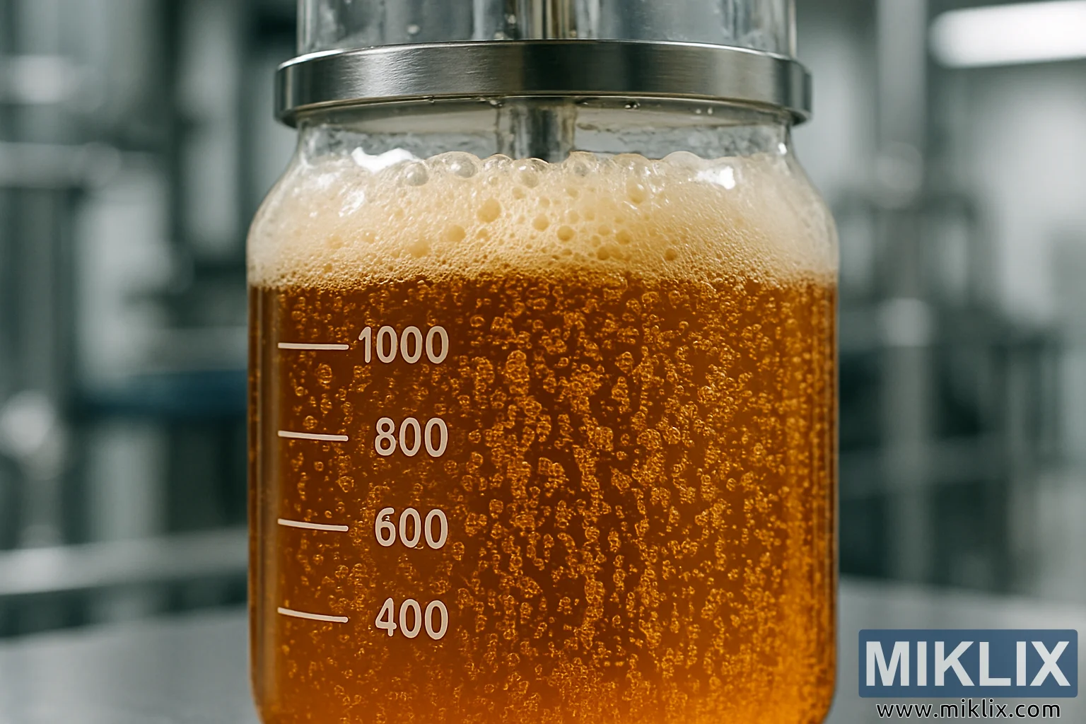 Esta imagem oferece um vislumbre fascinante e de alta ampliação do dinâmico processo biológico da fermentação, capturado em um ambiente controlado e de nível laboratorial. O ponto focal é um recipiente de vidro transparente e resistente, provavelmente um béquer ou um fermentador especializado, marcado com linhas de graduação quantitativas brancas que indicam o volume em mililitros (400, 600, 800 e 1000 mL). Essas marcações ressaltam a natureza precisa e científica da operação observada, onde o volume e a medição são essenciais para a integridade experimental e a ampliação da escala para a produção.