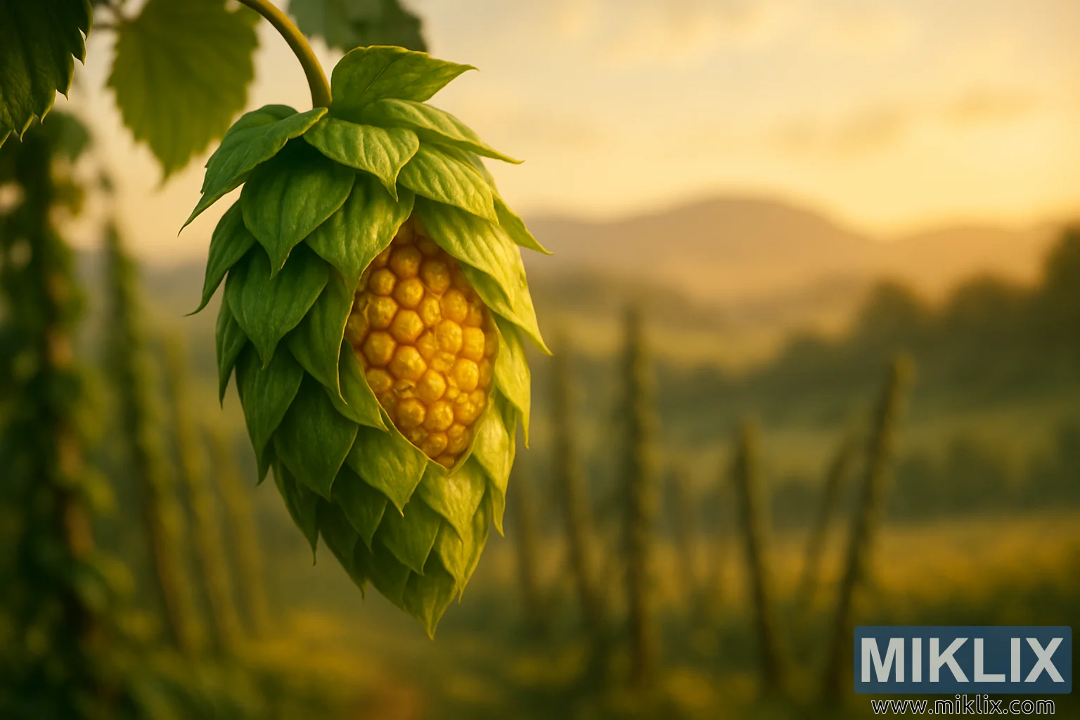 imagem apresenta uma representação impressionante, quase poética, de um cone de lúpulo suspenso na luz dourada do final da tarde, sua forma dominando o primeiro plano com detalhes botânicos intrincados. O próprio cone de lúpulo é retratado com meticulosa precisão: suas brácteas, em forma de escamas sobrepostas, são de um verde intenso e vibrante, curvando-se suavemente para fora e para baixo em camadas sucessivas. Entre essas estruturas semelhantes a folhas, encontra-se o coração do cone, onde as glândulas de lupulina douradas brilham como aglomerados de resina preciosa. As glândulas são roliças e têm uma textura semelhante a um favo de mel, seu tom amarelo-dourado reluzindo contra o contraste das brácteas verdes circundantes. Esse detalhe confere ao cone uma presença quase de joia, incorporando tanto a vitalidade da planta quanto seu papel essencial na fabricação de cerveja, onde a lupulina é valorizada por conferir aroma, sabor e amargor à cerveja.