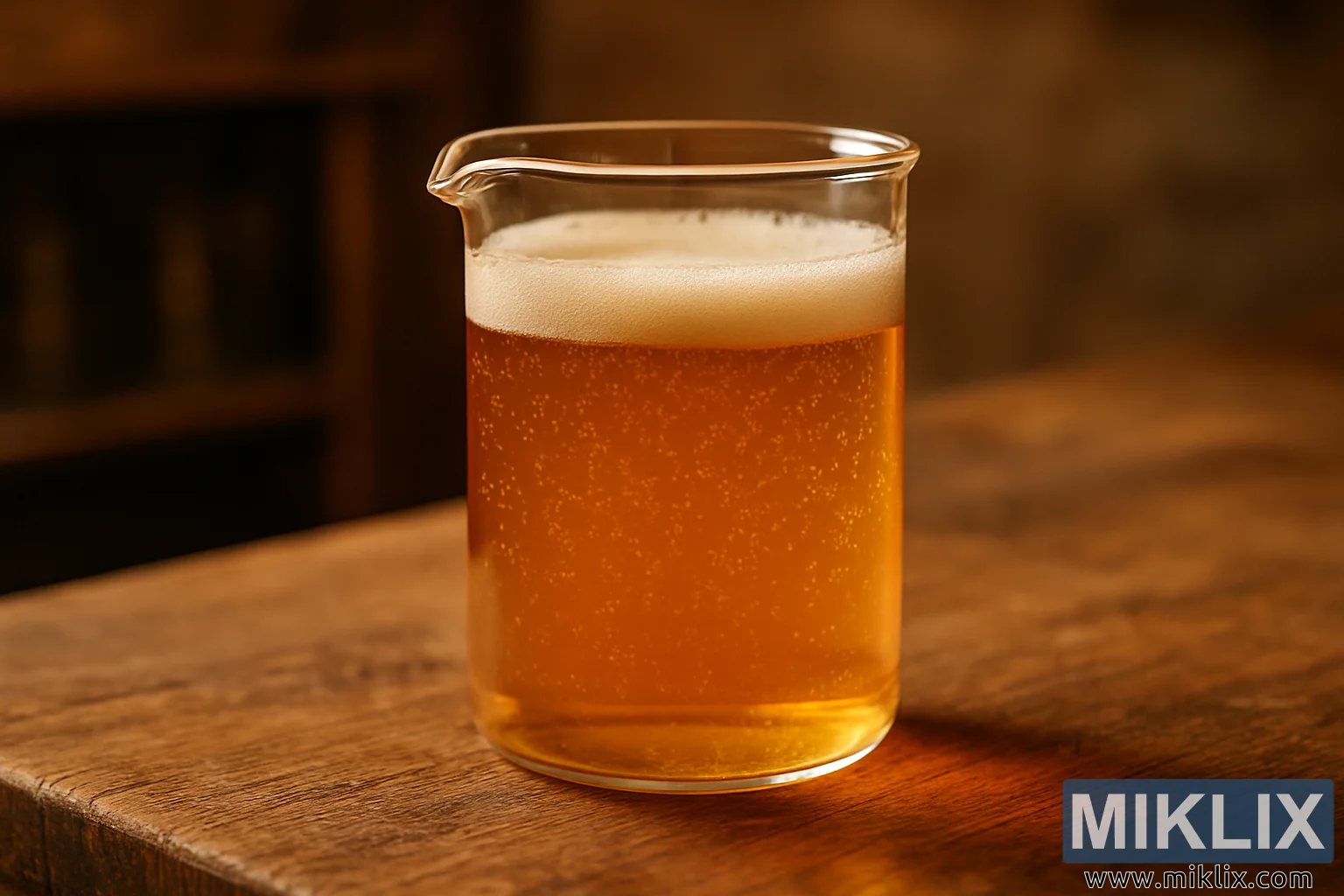 imagem retrata uma cena rústica, porém refinada, de fabricação de cerveja, centrada em um béquer de vidro transparente cheio de um líquido dourado e efervescente. Repousando sobre uma superfície de madeira em tons quentes, o béquer se destaca como o elemento focal, exalando tanto precisão científica quanto charme artesanal. Sua forma cilíndrica é clara e despojada, sem qualquer escala de medição ou marcações, o que enfatiza a pureza e a simplicidade do próprio líquido de fabricação.