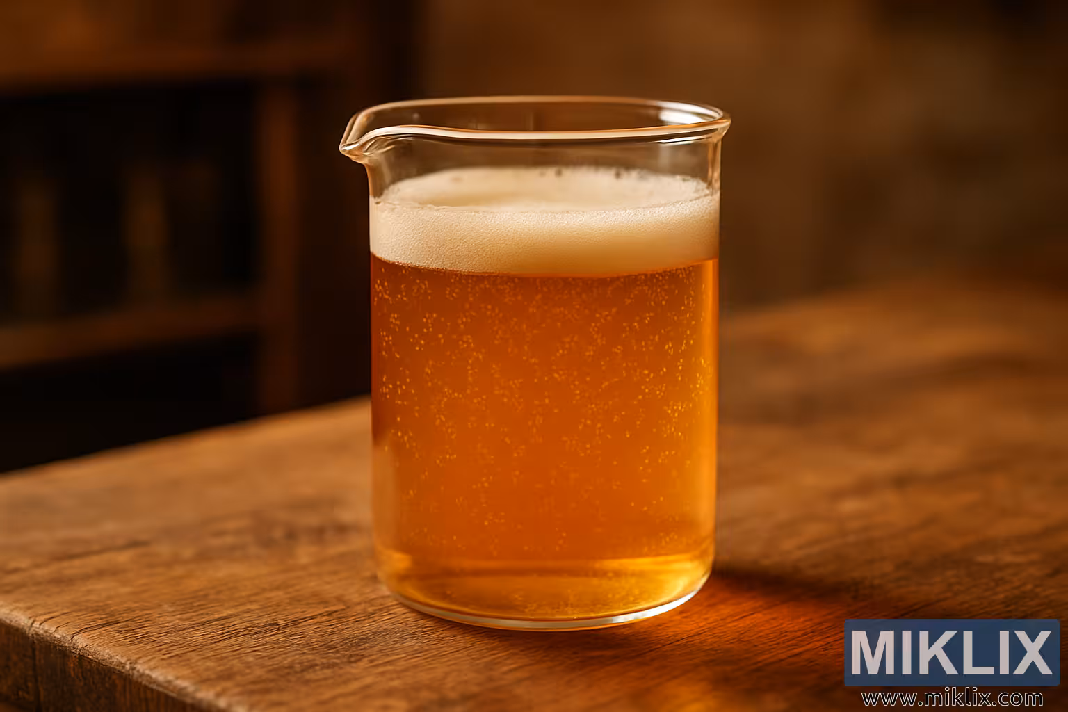 composição geral é uma metáfora visual para o equilíbrio entre arte e ciência na produção de cerveja. Por um lado, o béquer simboliza a precisão, a medição e a experimentação controlada do processo. Por outro, o líquido dourado e borbulhante e a superfície rústica de madeira evocam tradição, aconchego e o toque humano que transforma ingredientes crus em uma bebida artesanal. Ao combinar esses elementos, a imagem captura a essência dual da produção de cerveja: um processo meticuloso guiado pela química e uma tradição artesanal que celebra o sabor, o aroma e a experiência sensorial.