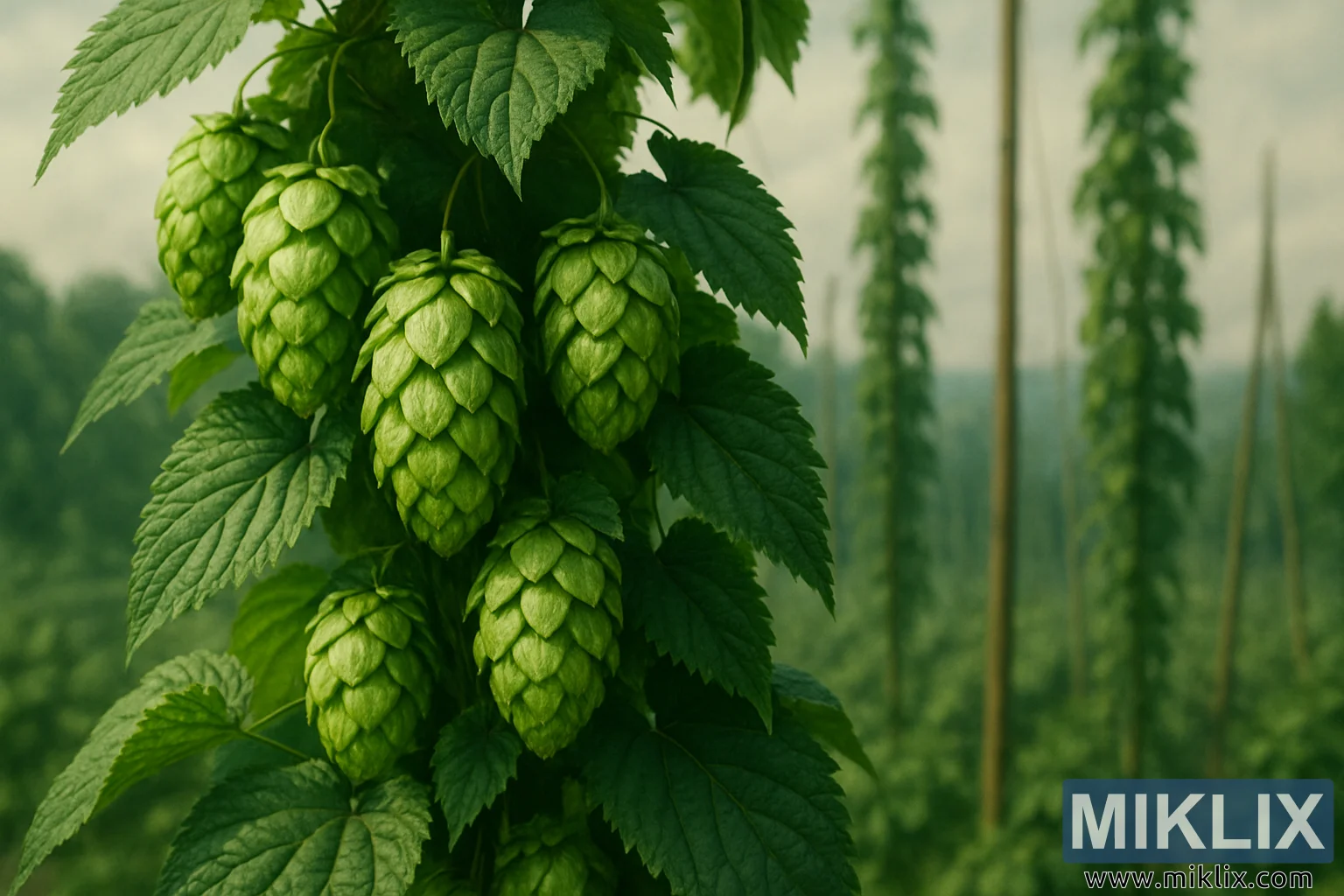 Imagem: Pinhas de lúpulo exuberantes em uma paisagem agrícola histórica.