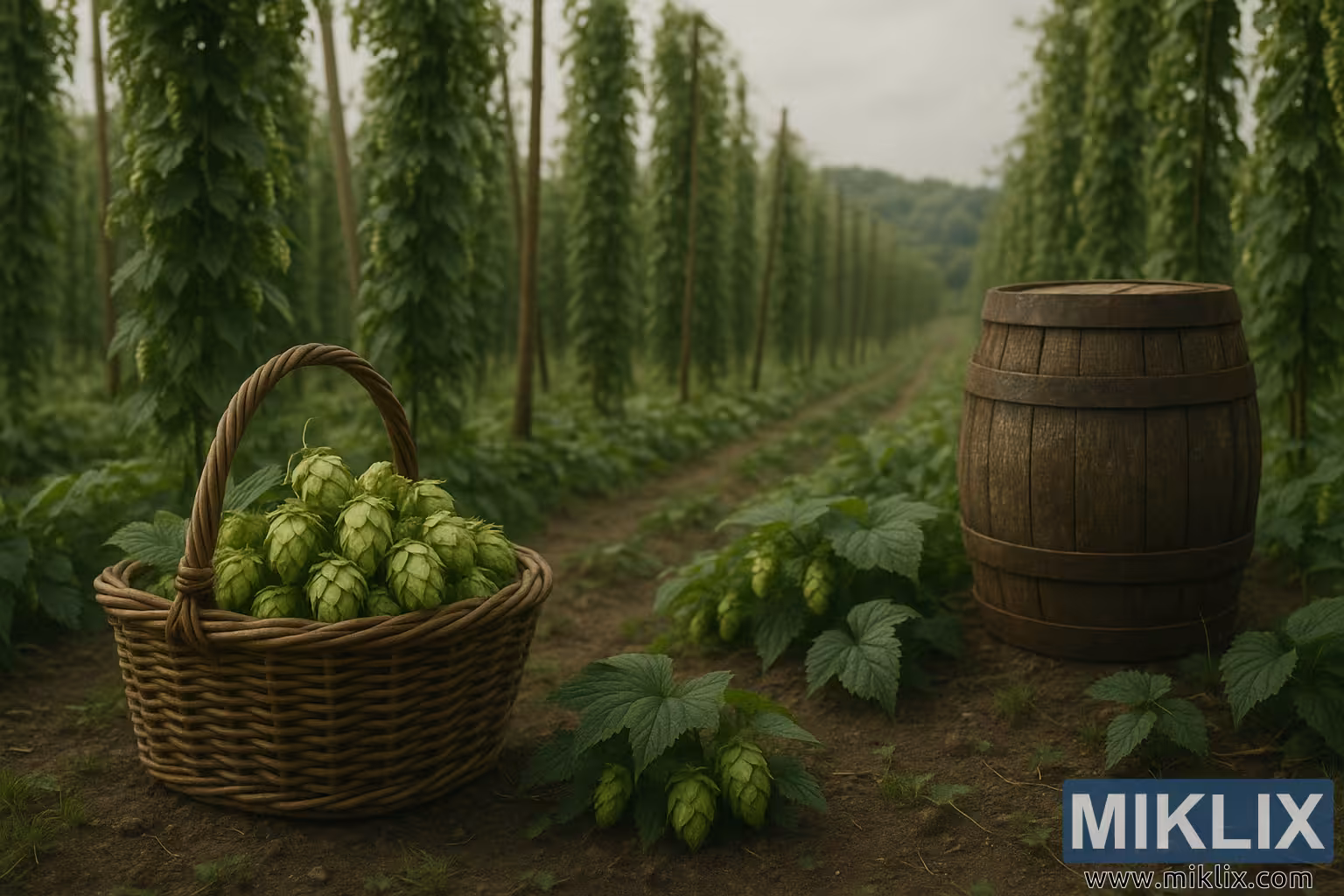 Ao lado da cesta, encontra-se um barril de carvalho desgastado, cujas aduelas ostentam as marcas sutis de anos, senão décadas, de uso. O barril é mais do que um objeto utilitário — é um símbolo da continuidade entre agricultura e artesanato, o elo entre a colheita crua e a bebida refinada. Em sua madeira desgastada está gravada a história de inúmeras cervejas passadas, a resistência silenciosa de uma ferramenta que foi tão vital para a produção de cerveja quanto o próprio lúpulo. Sua presença no campo serve como um lembrete dos ciclos de trabalho e recompensa: os cones em breve serão secos, processados e armazenados, alguns destinados à fermentação junto com o malte e a levedura, outros talvez embalados para uso futuro. Nesse momento, o barril representa tanto a prontidão quanto a paciência, a ponte entre a imediatez da colheita e o longo trabalho de fermentação e maturação.