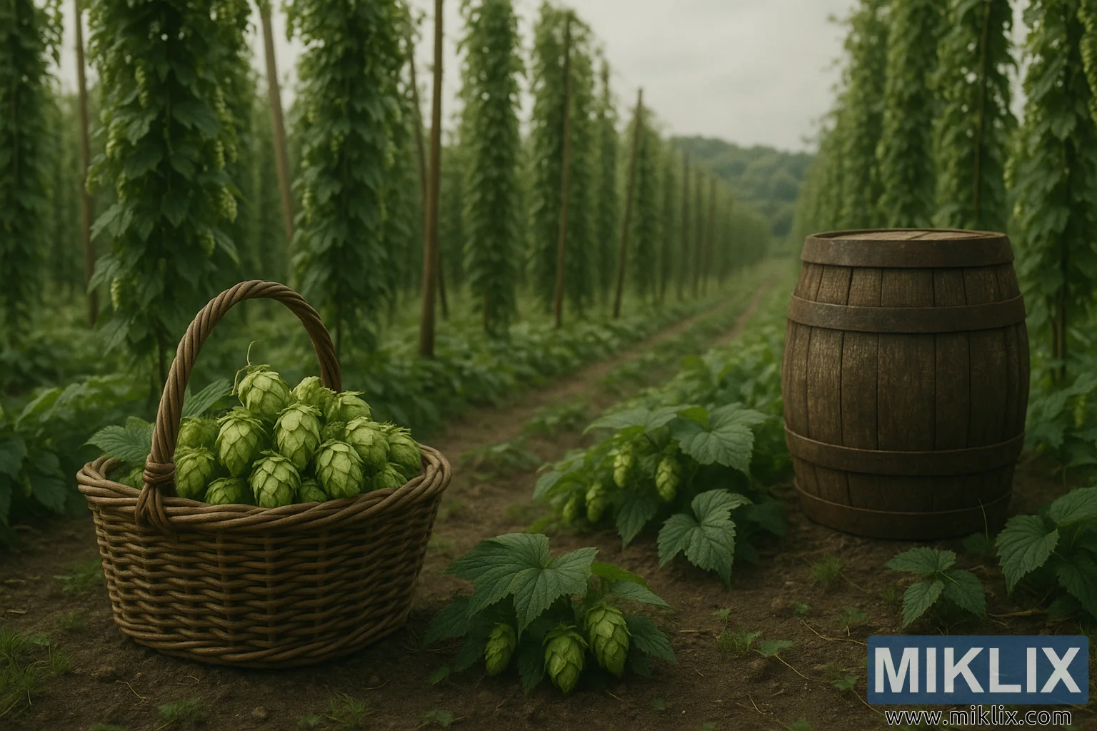 Uma fazenda de lúpulo em Sussex com lúpulo fresco em uma cesta, treliças altas e um barril de carvalho, refletindo a tradição e os desafios do cultivo regional de lúpulo.