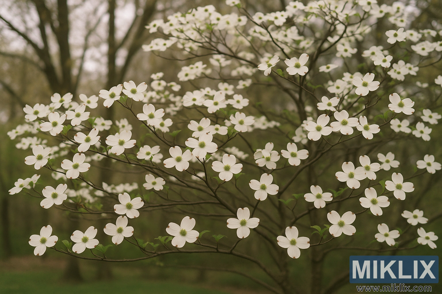 Uma serena fotografia de paisagem de uma árvore de corniso florido (Cornus florida) coberta de delicadas brácteas brancas no início da primavera, tendo como pano de fundo uma floresta suavemente desfocada.