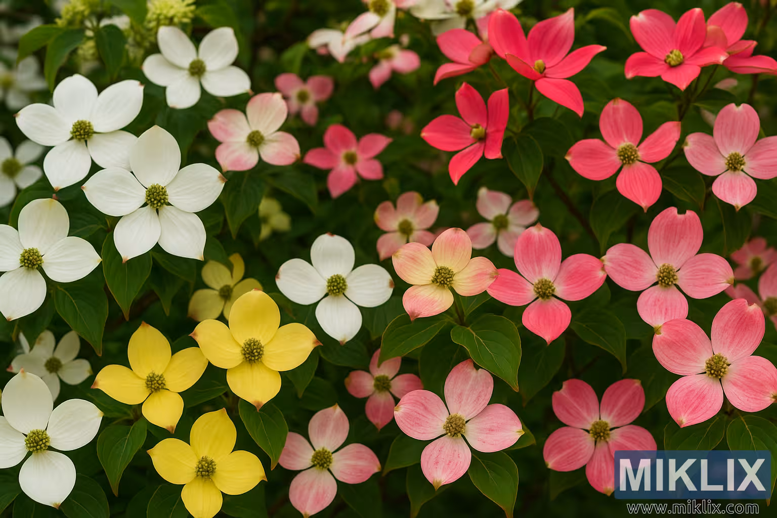 Esta fotografia de paisagem em alta resolução captura uma coleção deslumbrante de variedades de corniso (Cornus spp.) em plena floração, exibindo a cativante diversidade do gênero. A composição apresenta uma tapeçaria exuberante de flores em vários tons de branco, rosa e amarelo, cada espécie distinguida por sua forma floral única e sutis diferenças no formato e textura das pétalas. Os cornos brancos cremosos exibem a clássica simetria de quatro pétalas, com suas brácteas lisas afilando-se suavemente em direção a centros verde-claros compostos por estruturas reprodutivas agrupadas. Próximos a eles, as variedades rosas exibem uma gama de tonalidades — de tons rosados pálidos nas bordas das pétalas a um magenta intenso no centro — sugerindo tanto variação natural quanto seleção hortícola. Os cornos amarelos adicionam um toque raro, porém luminoso, com suas pétalas douradas contrastando lindamente com a vegetação ao redor.